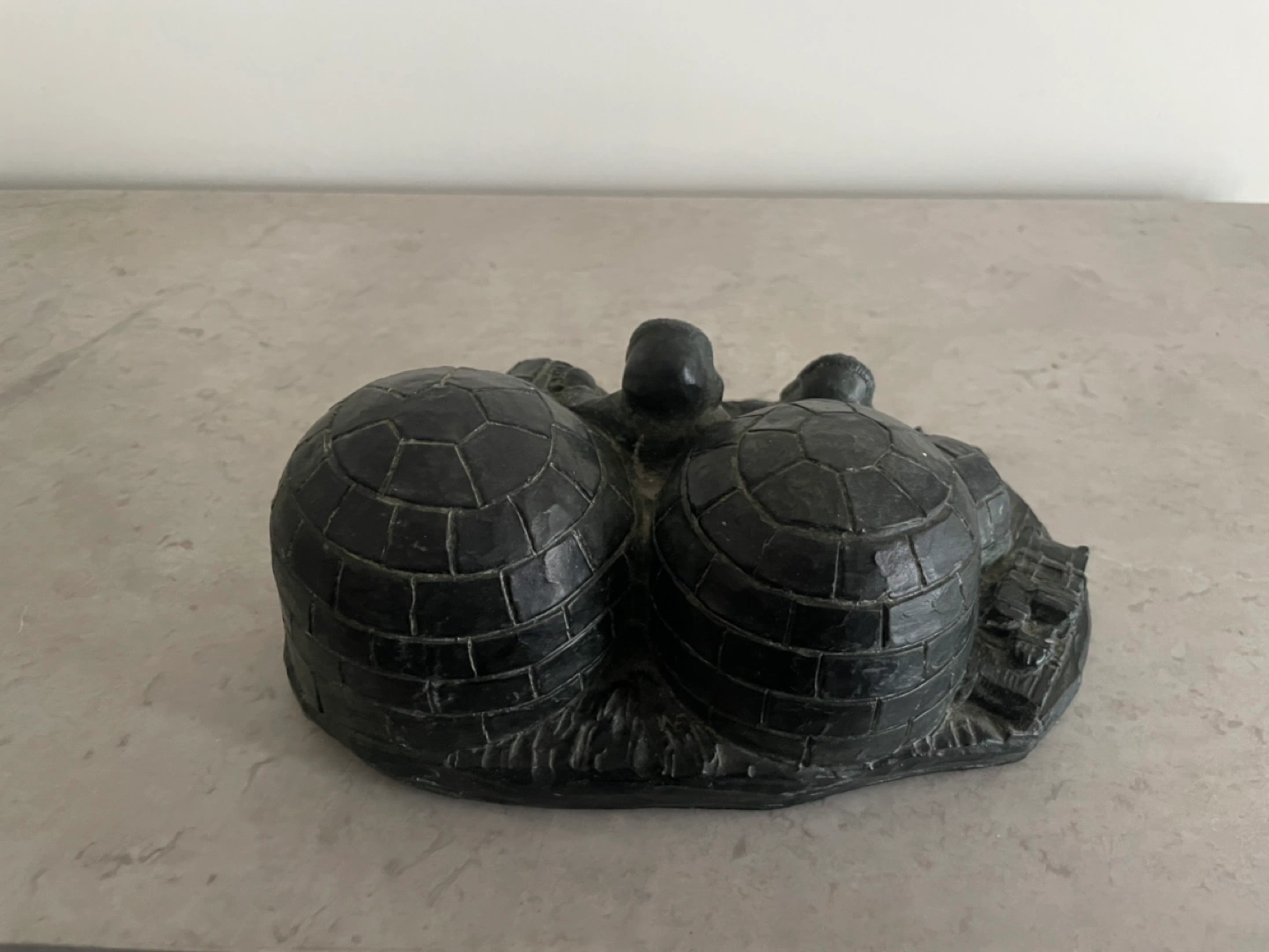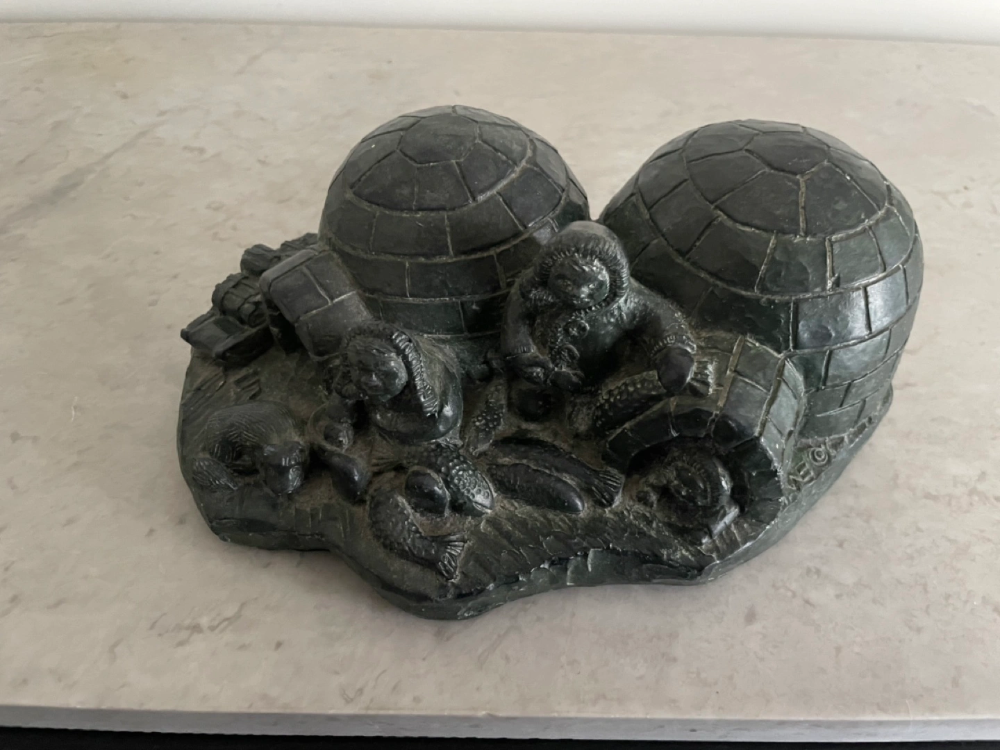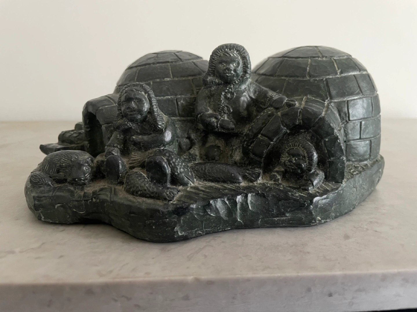 Hand-carved soapstone sculpture. Depicts two igloos and Inuit figures. Made in Canada. A Wolf Sculptures original.