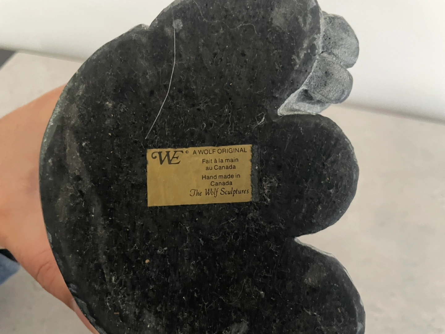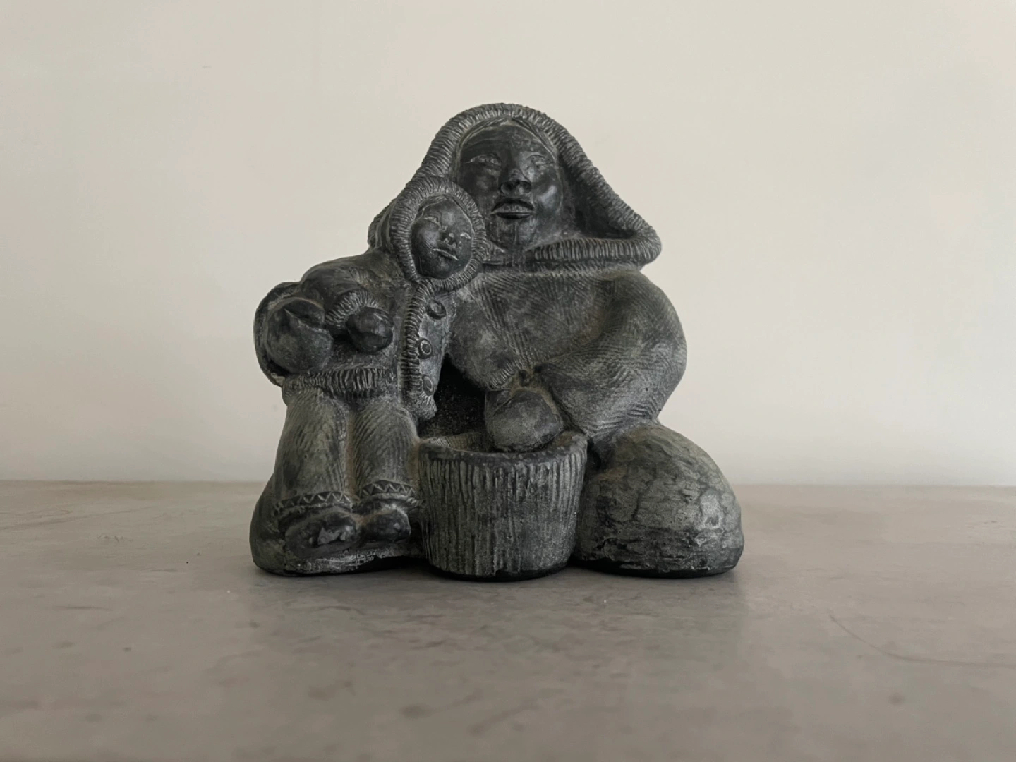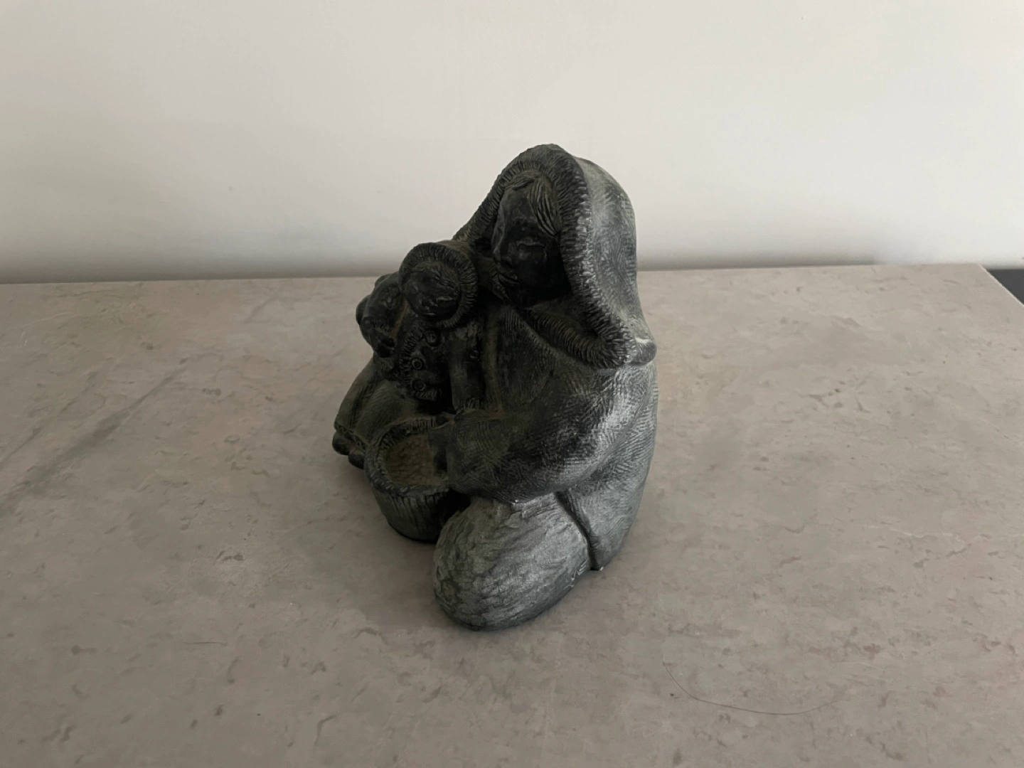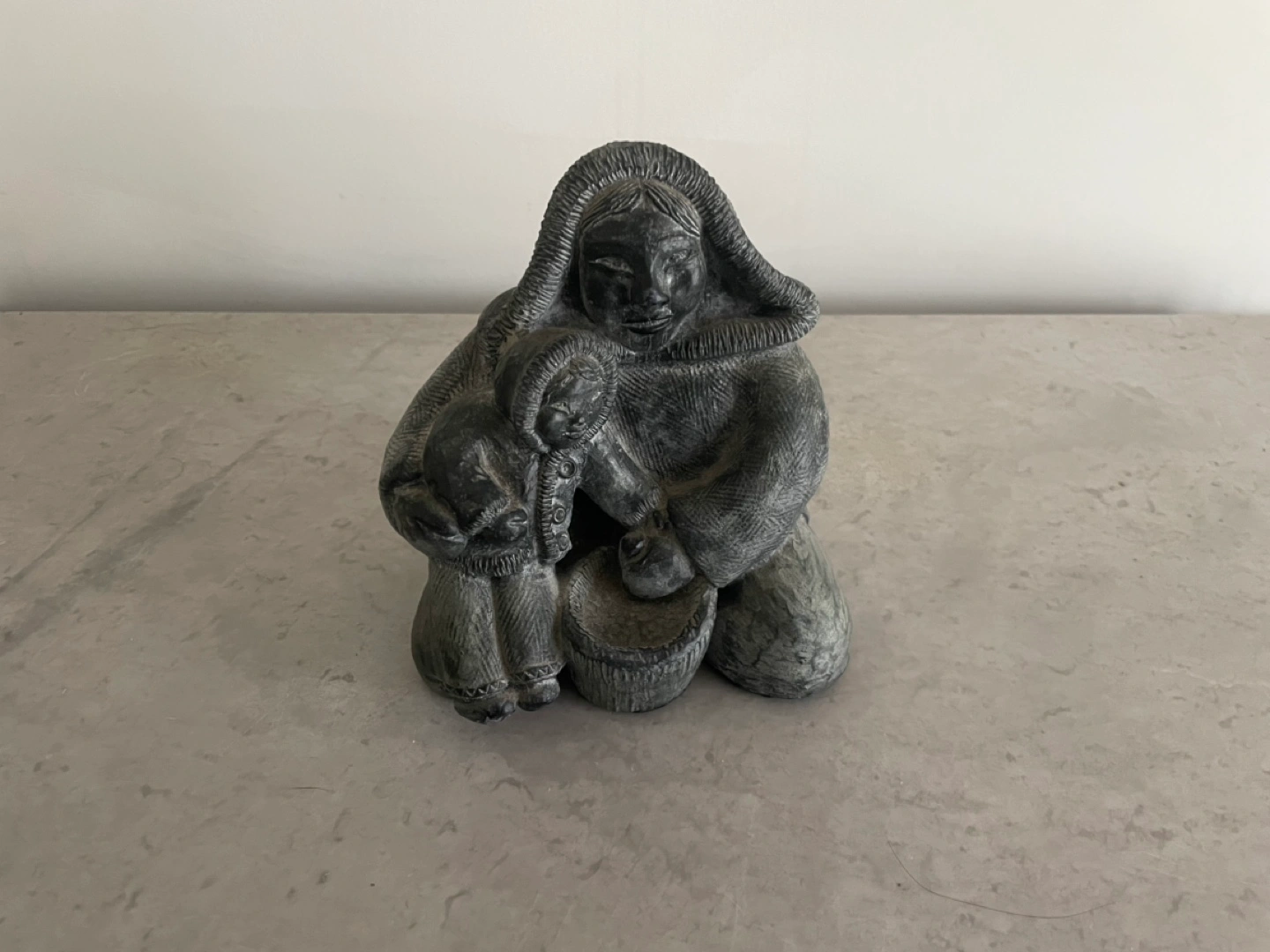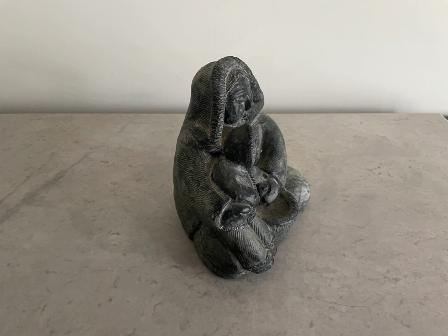 Hand-carved soapstone sculpture. Depicts a mother and child. Made in Canada by The Wolf Sculptures.