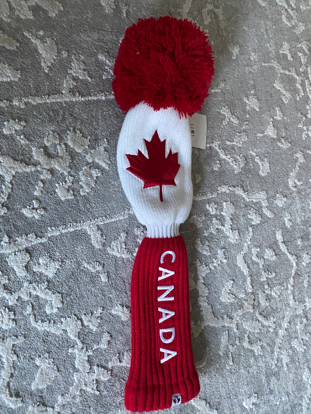Red and white knitted golf club headcover. Features a large pom-pom, embroidered Canadian maple leaf, and CANADA lettering. Suitable for putter or other golf club.