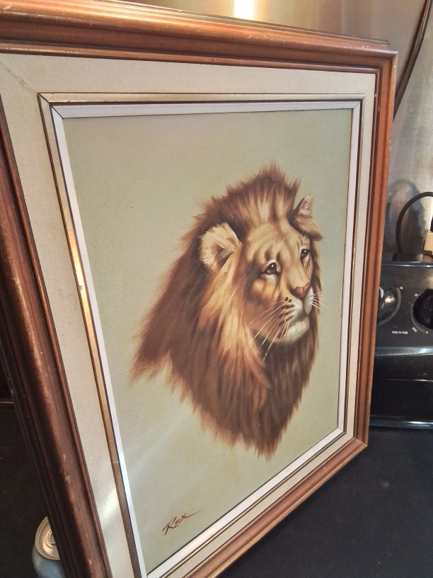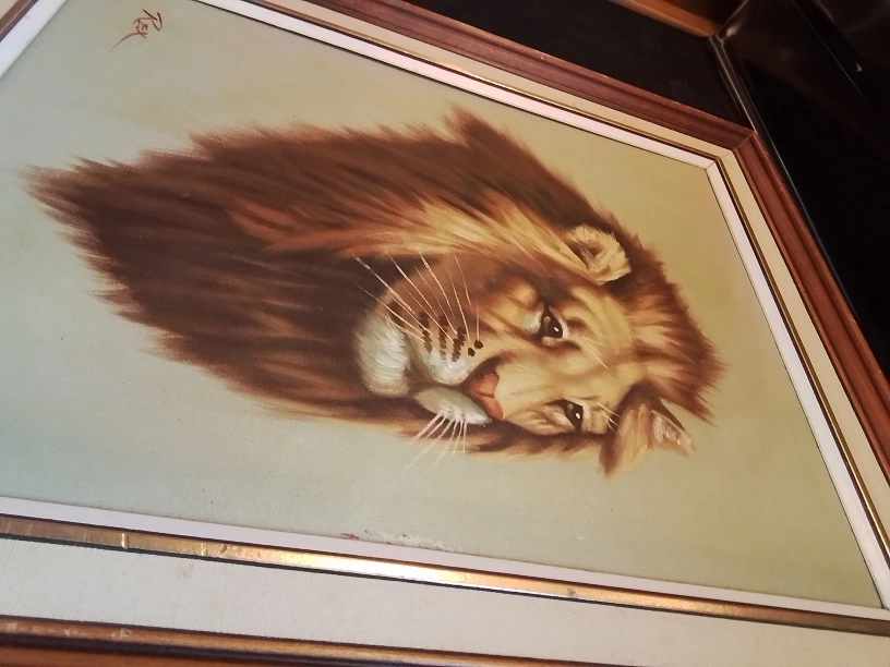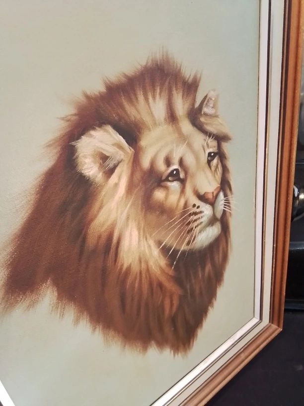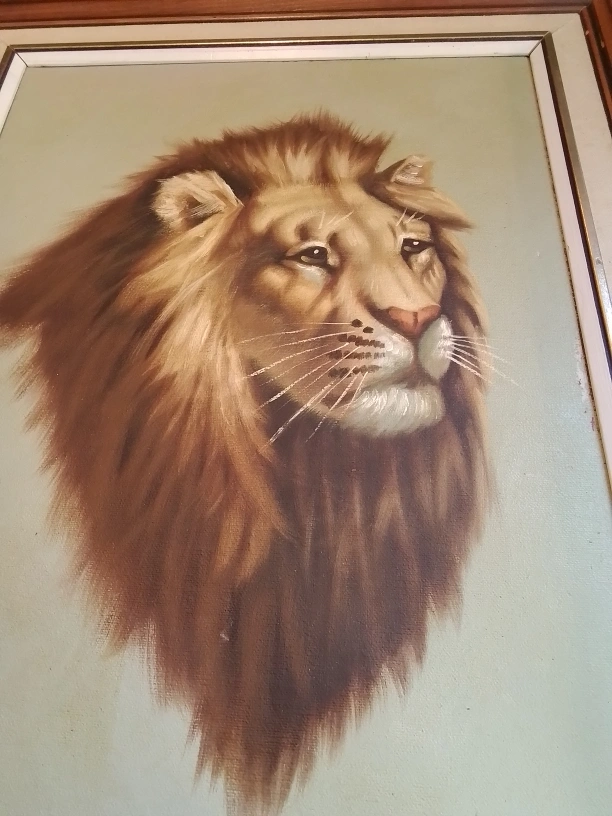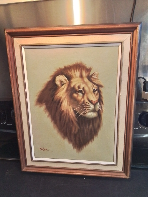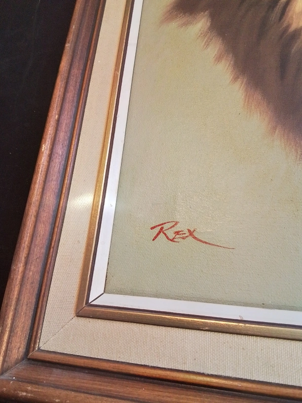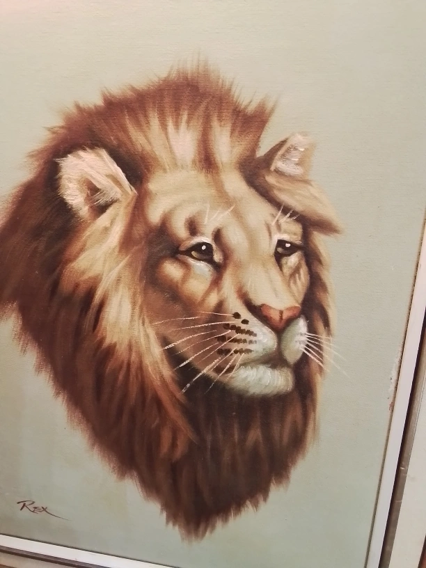 Canadian Oil on Canvas Signed REX 532 Framed painting of a lion's head. Oil on canvas. Brown wooden frame. Artist signature: Rex. Oil on canvas, framed. The artwork features a meticulously painted portrait of a lion. The majestic and regal presence of the animal is captured with intricate detail in its fur, showcasing varying tones and textures. Signed REX on bottom left corner. "532" inscribed on verso. 39 x 30 cm (15" x 12"), F: 52 x 41 cm (20 1/2" x 16") Pickup at Young Street and Steels Ave