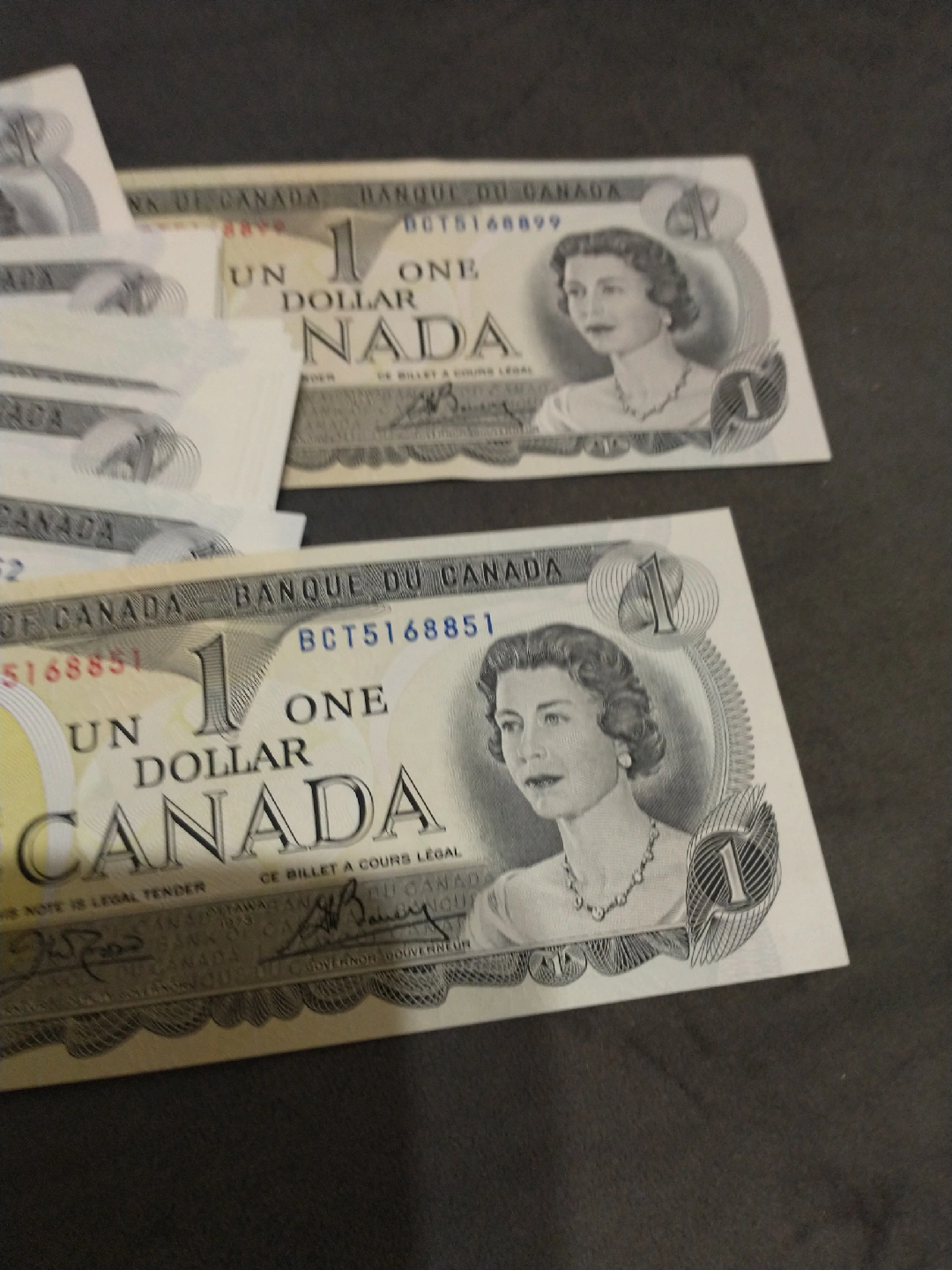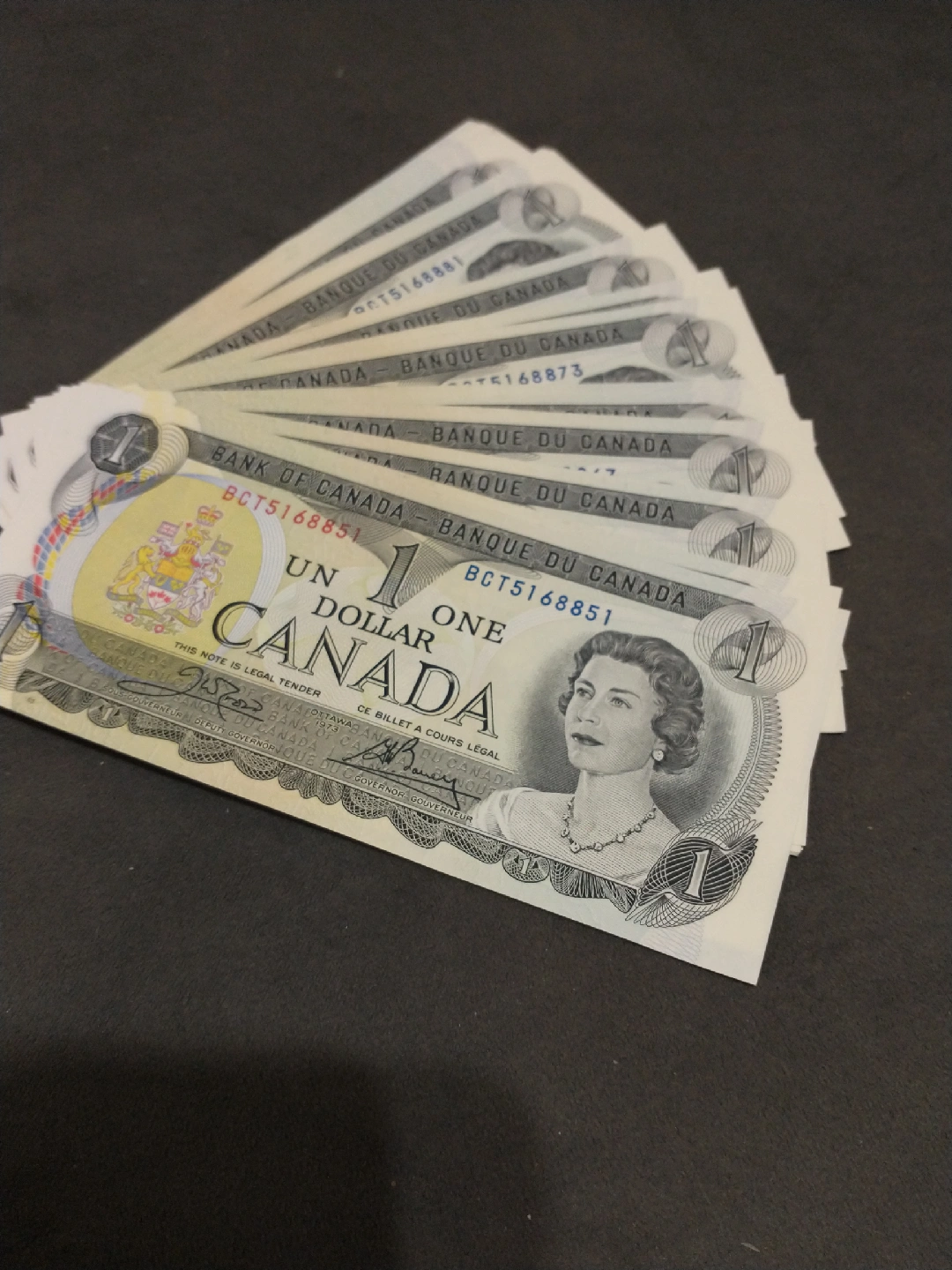 Show all1973 Canada $1 banknotes consecutive serial nos ending 8851-8899