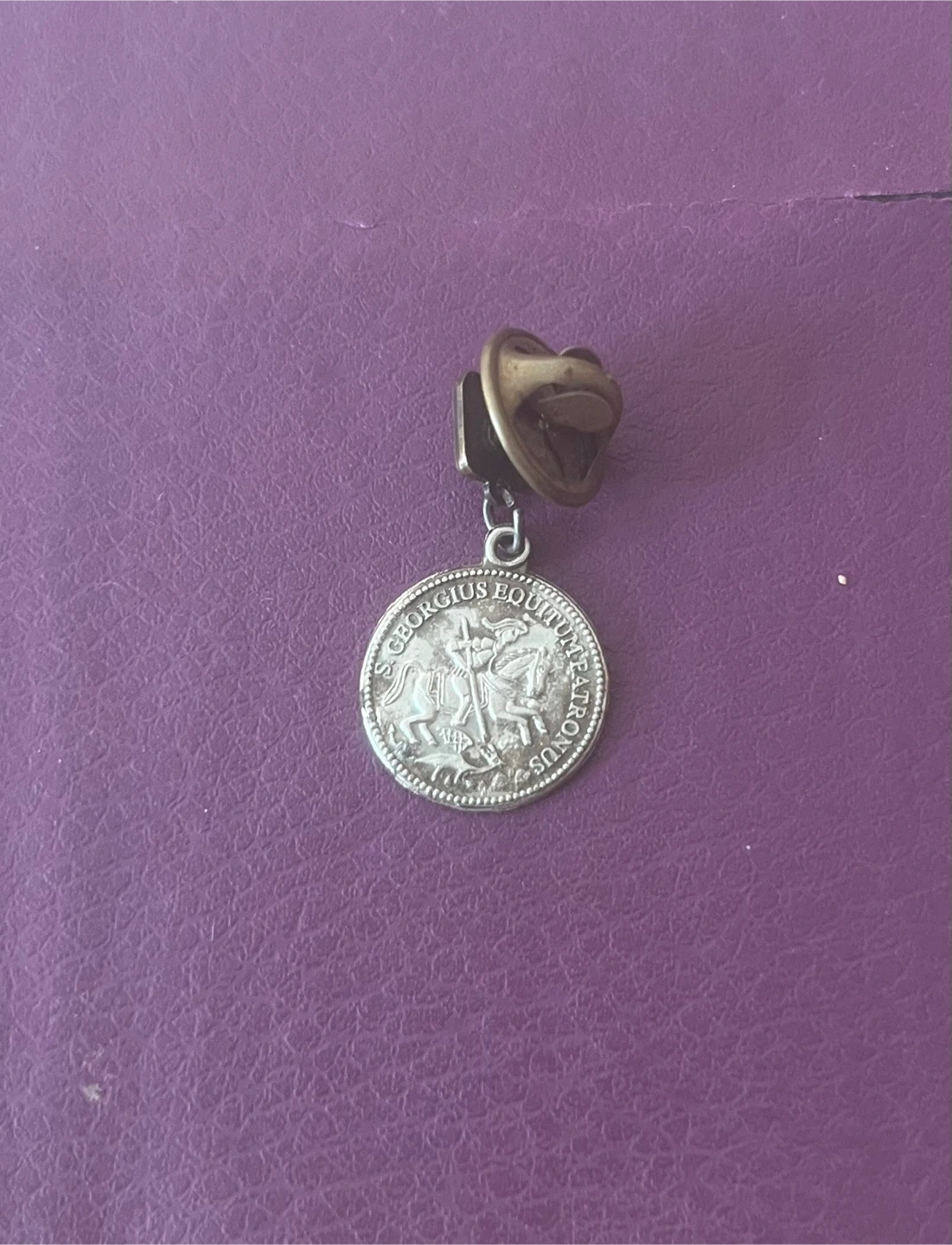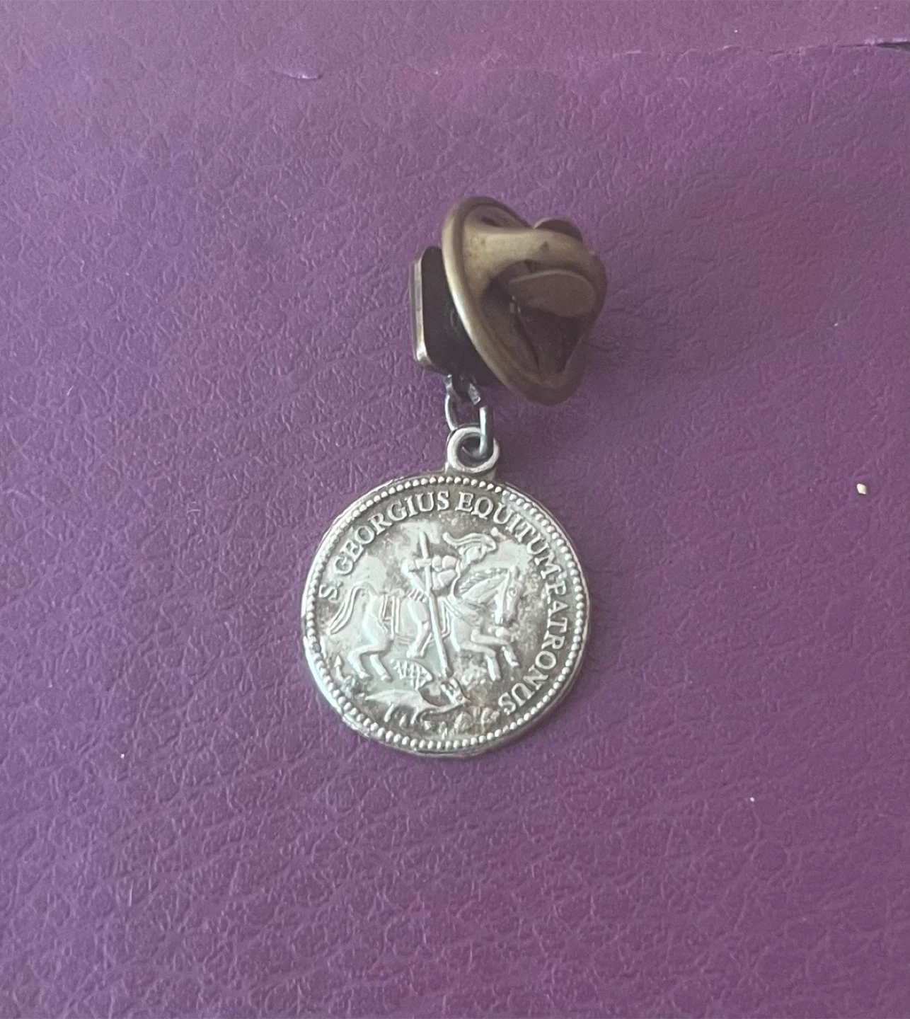 Selling a vintage pin. It features a detailed design on both sides. One side says 'INTERSTATE SECURITAS' and has a ship, while the other says 'S. GEORGIUS EQUITUM PATRONUS' with a knight on a horse. Great for collectors!