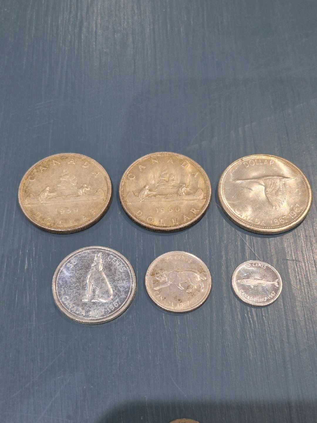 Selling three Canadian silver dollars and a 50 cent coins for 39x face value. Silver quarter and dime for 25x face value. Total value $145.25 Open to offers for other coins or better price if you buy all of it.