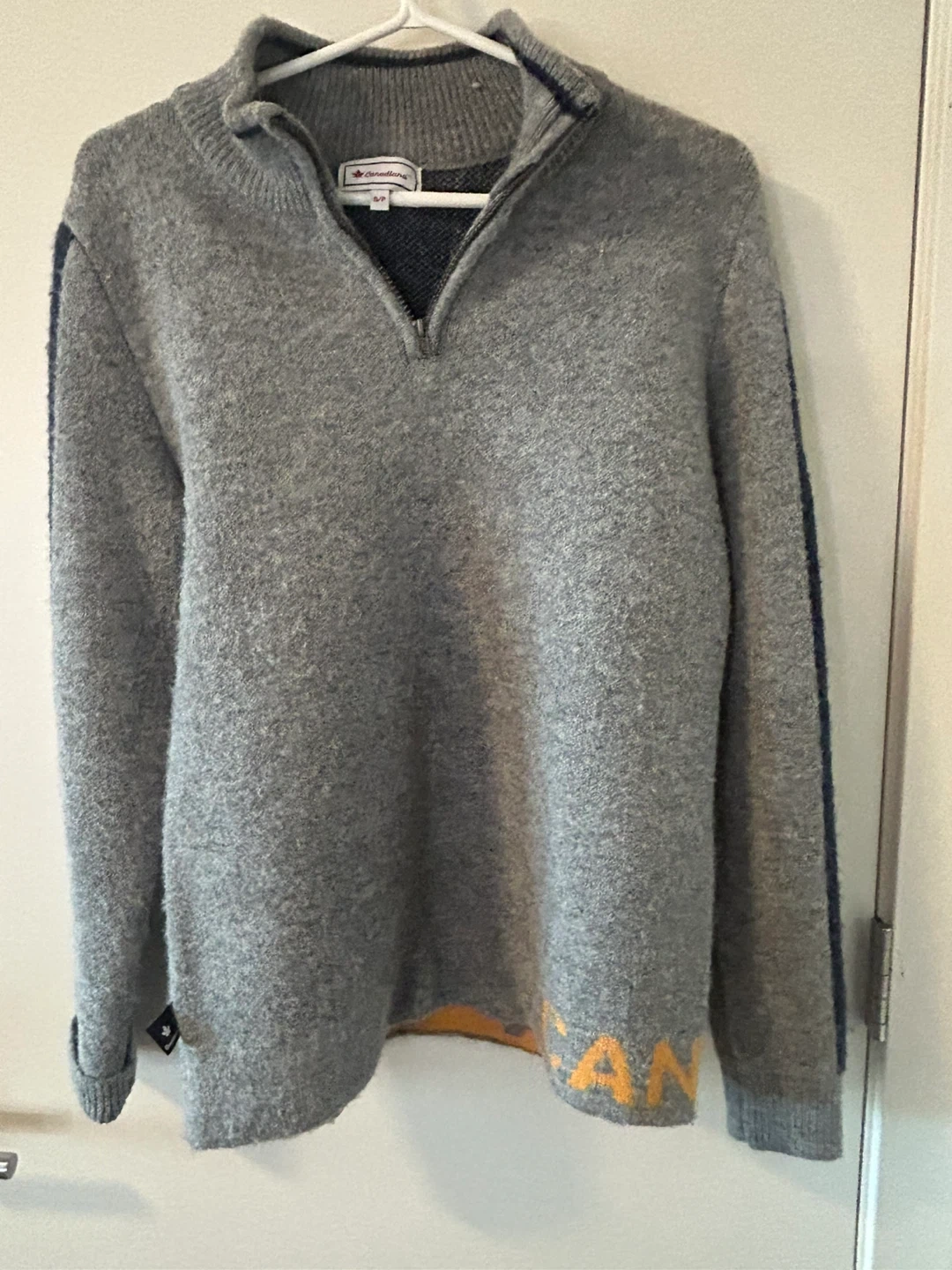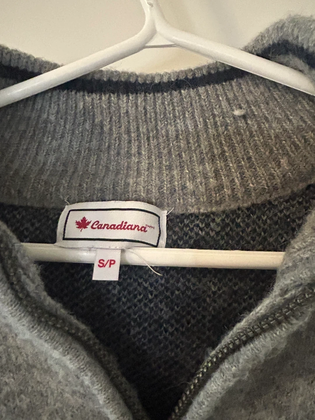 Cozy Canadian sweater in size Small/Petite! It's grey with blue stripes down the sleeves and 'CANADA' written in yellow on the bottom. Perfect for staying warm this winter