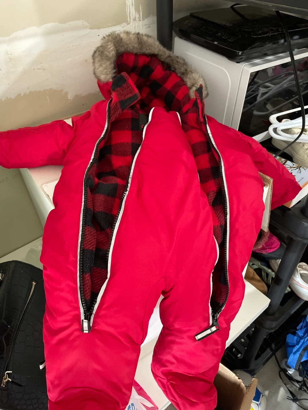 Keep your little one warm this winter with this adorable red snowsuit from Canadiana! It's sized for 6-12 month olds and I afeatures a cozy, plaid-lined hood with faux fur trim. Perfect for snowy adventures!