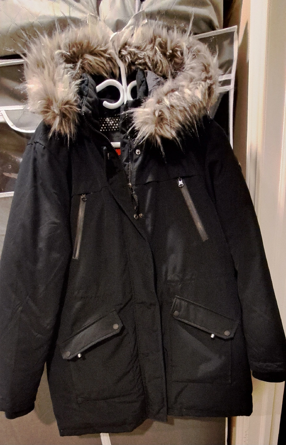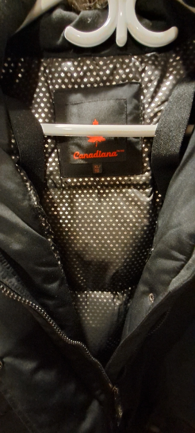 Selling a Canadiana winter parka in size XL. It's black and has a faux fur trim on the hood. Perfect for staying warm during the cold Canadian winters! Detachable fur. Spacious pockets. In very good condition. Very warm winter jacket