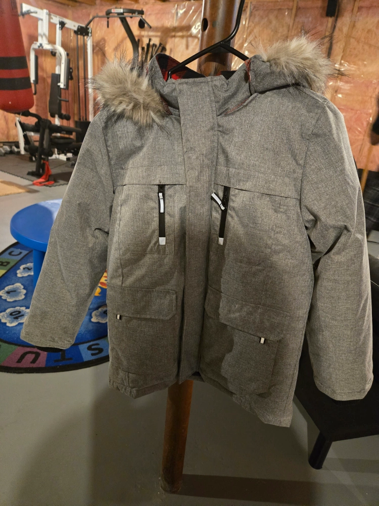 Grey winter jacket. Size large/large. Features a faux fur trimmed hood and red and black plaid interior. Multiple pockets. Excellent condition.