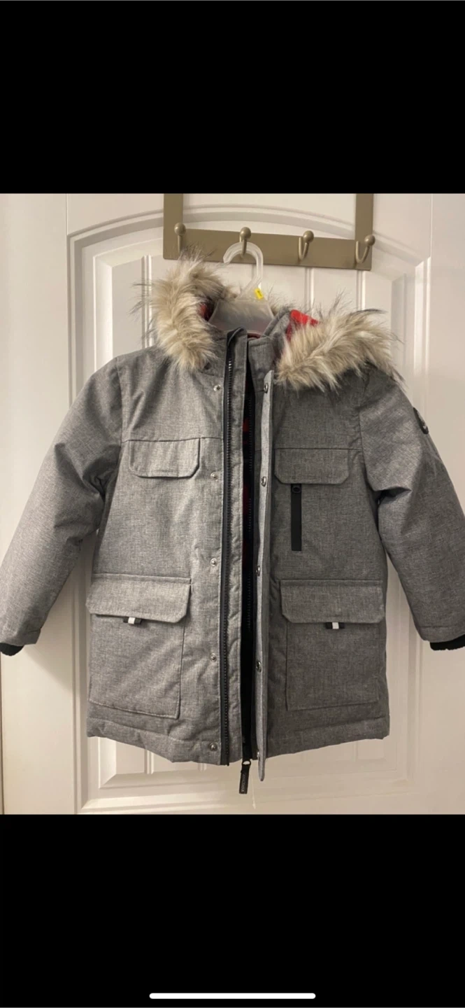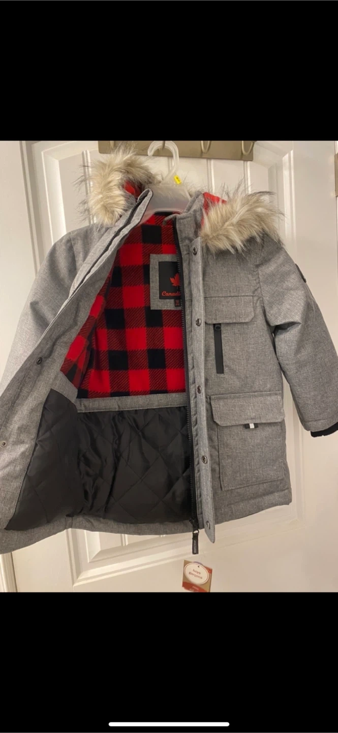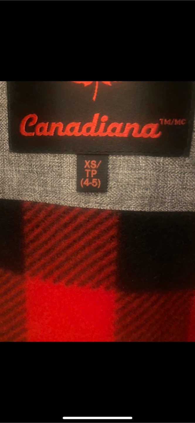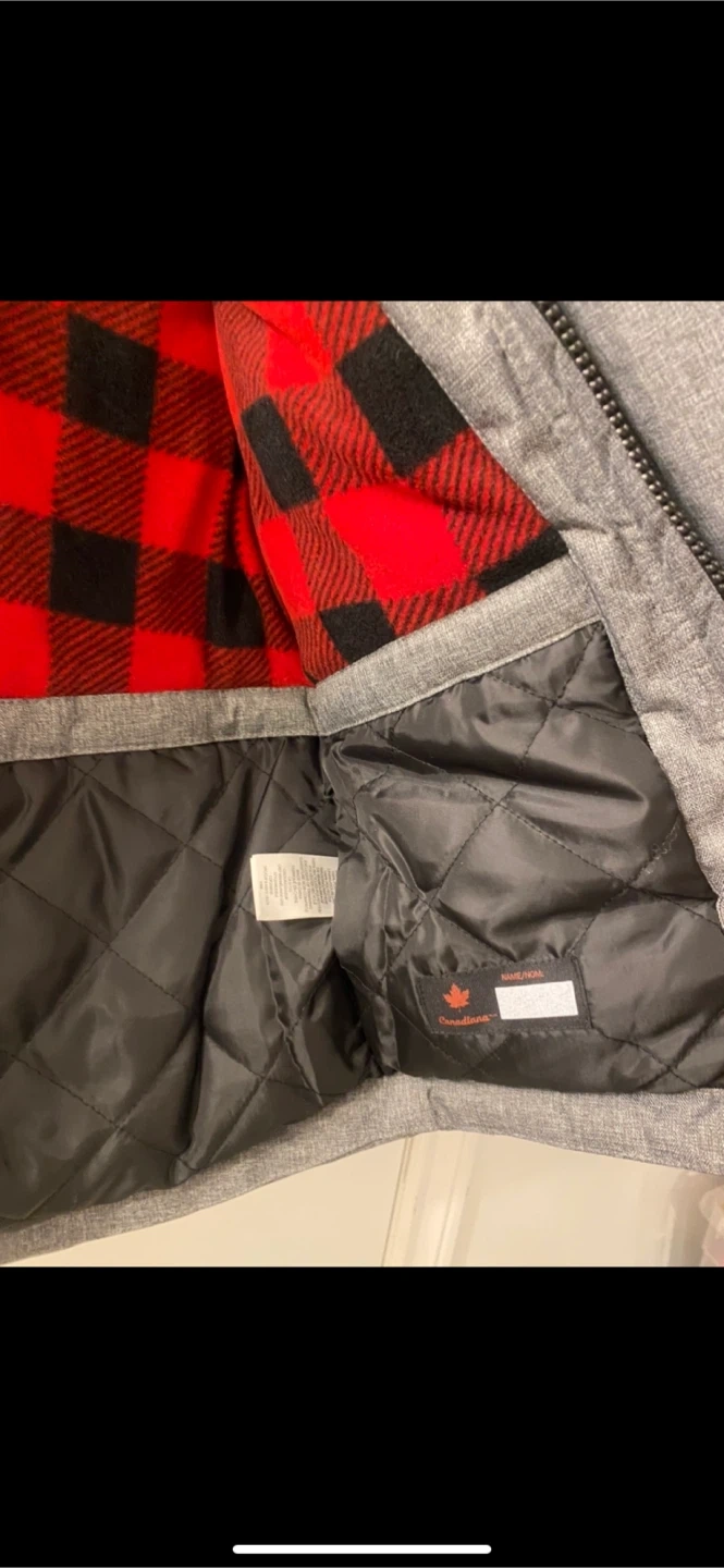 Keep your little one warm this winter with this Canadiana winter jacket! It's in great condition and features a stylish grey exterior with a cozy red and black plaid lining. - Brand: Canadiana - Size: XS (4-5) - Colour: Grey with red/black plaid lining Pick up Port Elmsley message please Originally bought for $69 plus tax