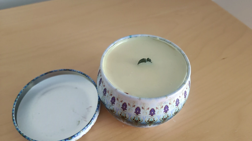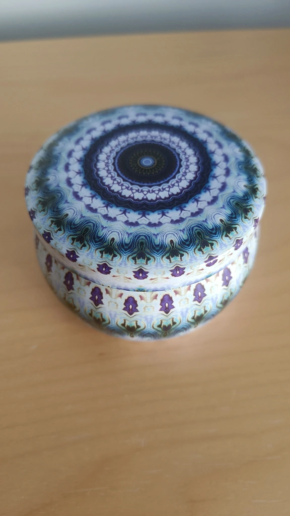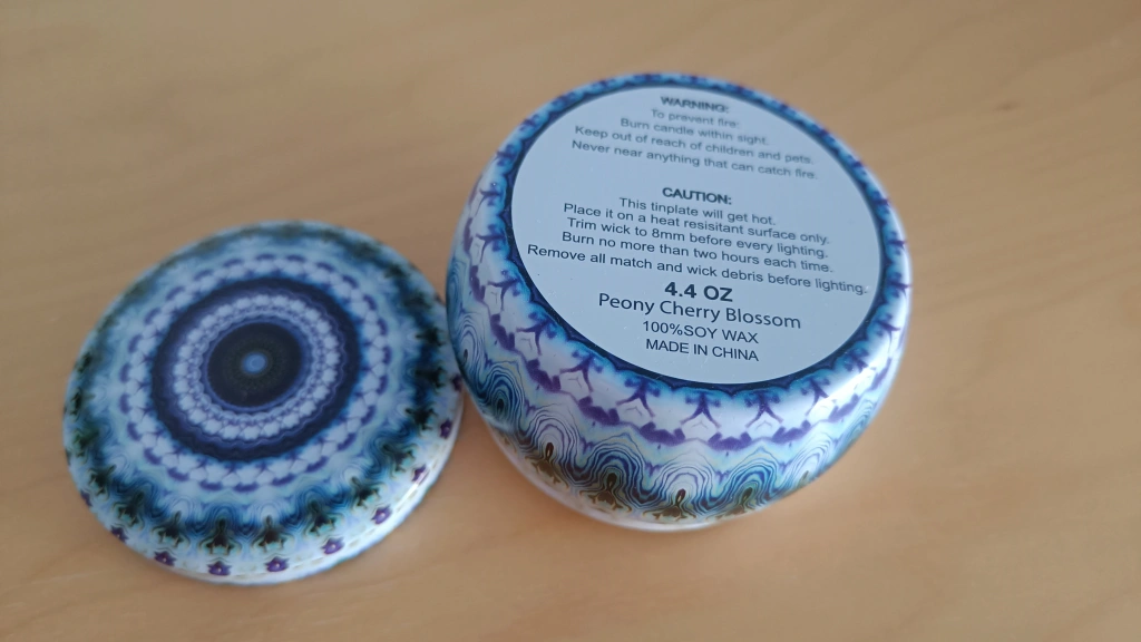 Selling a Peony Cherry Blossom candle in a decorative tin. It's 4.4 oz and made of 100% soy wax. The tin has a lovely blue and purple design. It's in great shape and ready to add a nice scent to your space!
