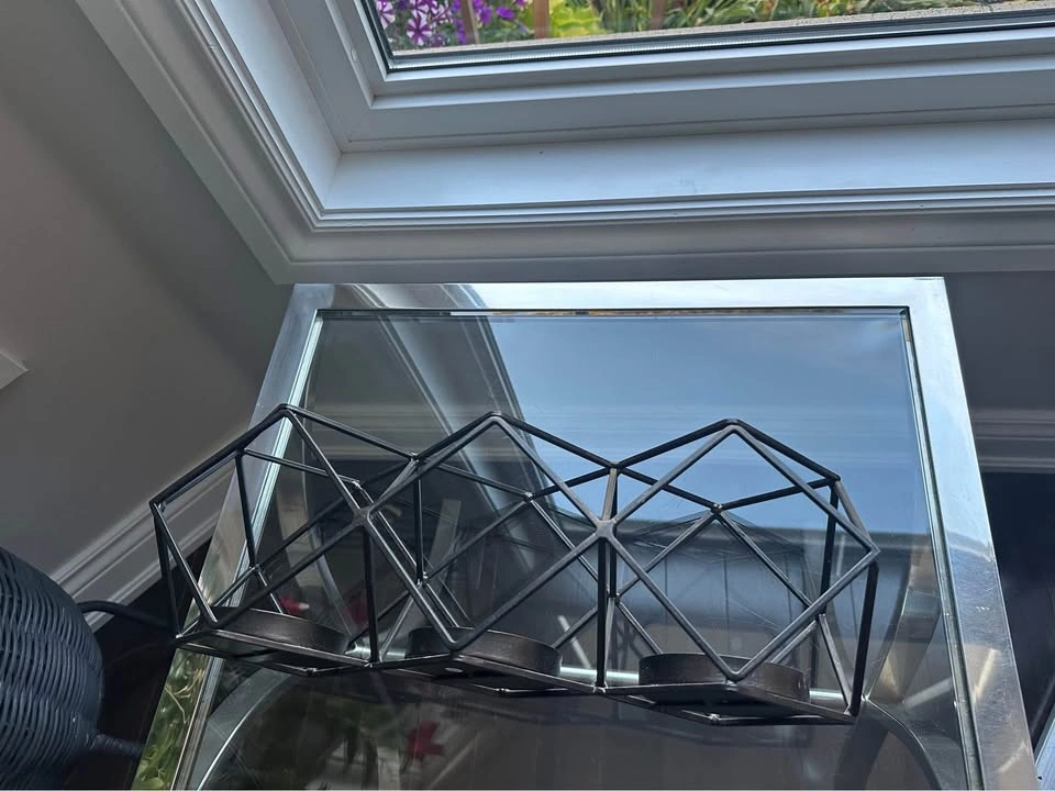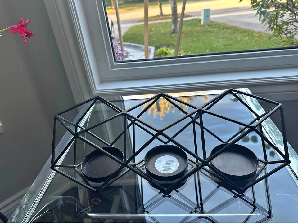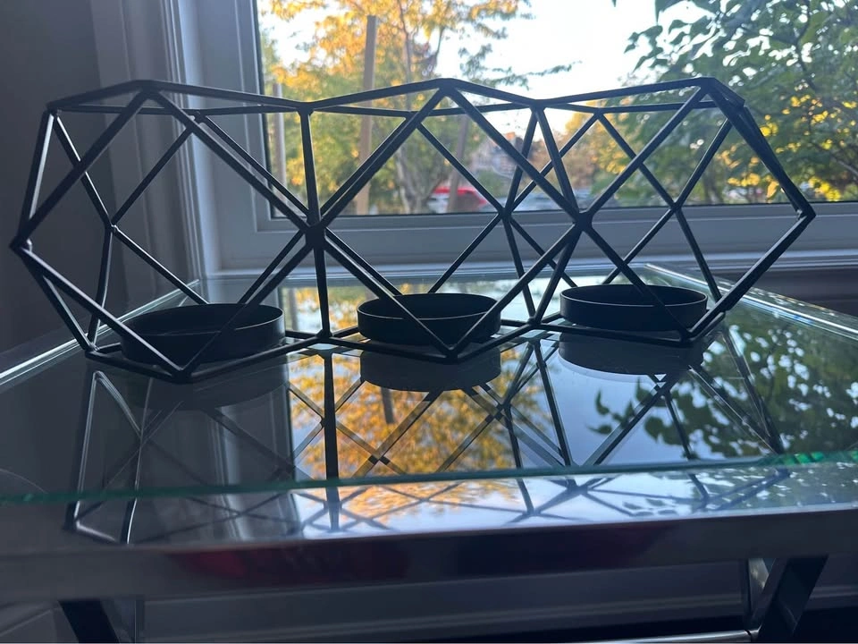 Beautiful candle holder that hold 3 small candles … it’s made of metal with a black/brown colour