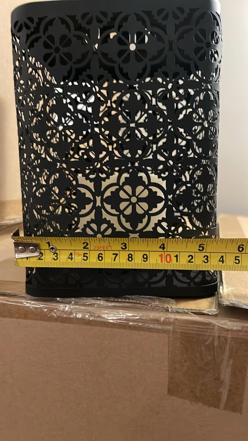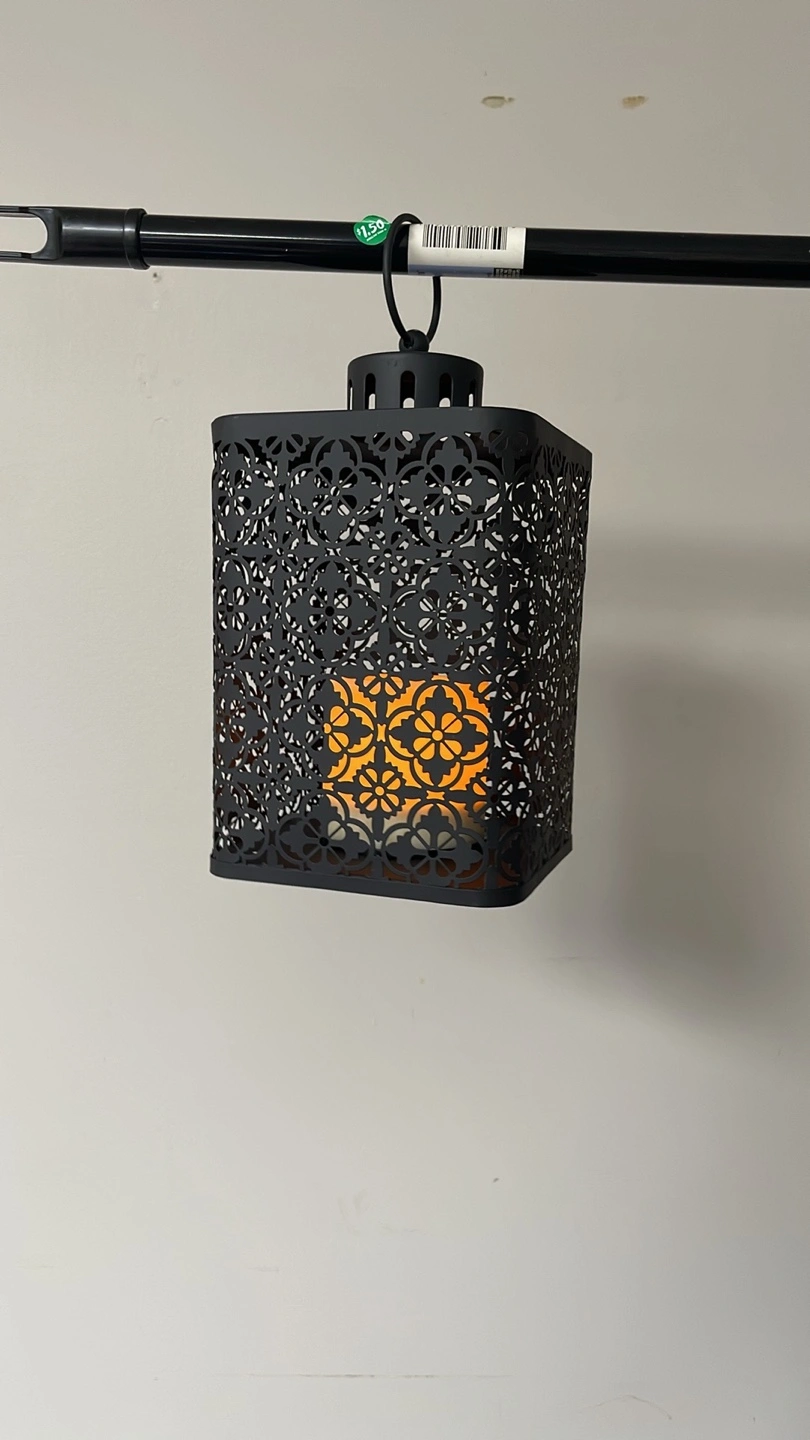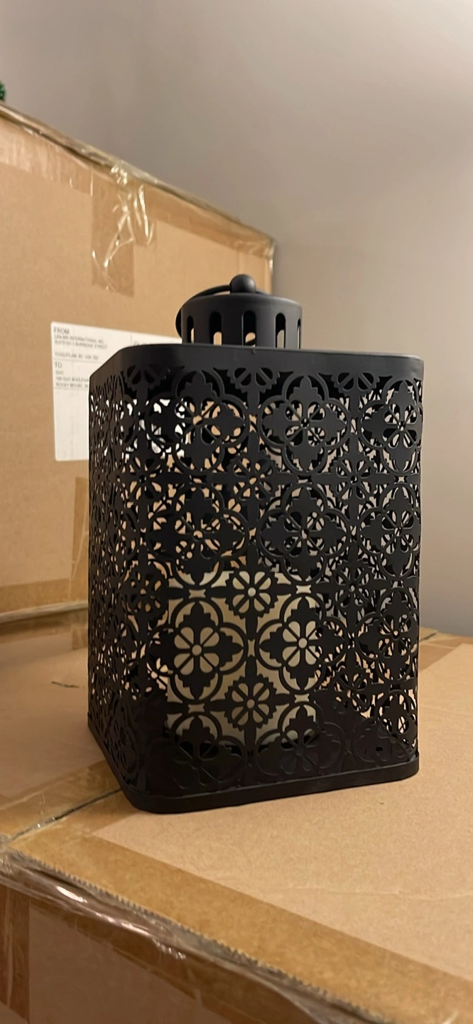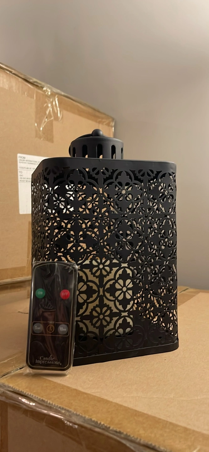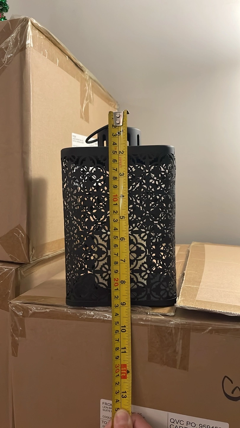This is a Candle Impressions black metal lantern with a decorative cutout design! It comes with a remote control for easy operation. The lantern measures approximately 5 inches wide and 12 inches tall. Perfect for adding a cozy ambiance to any room