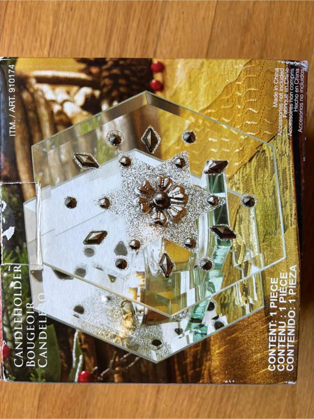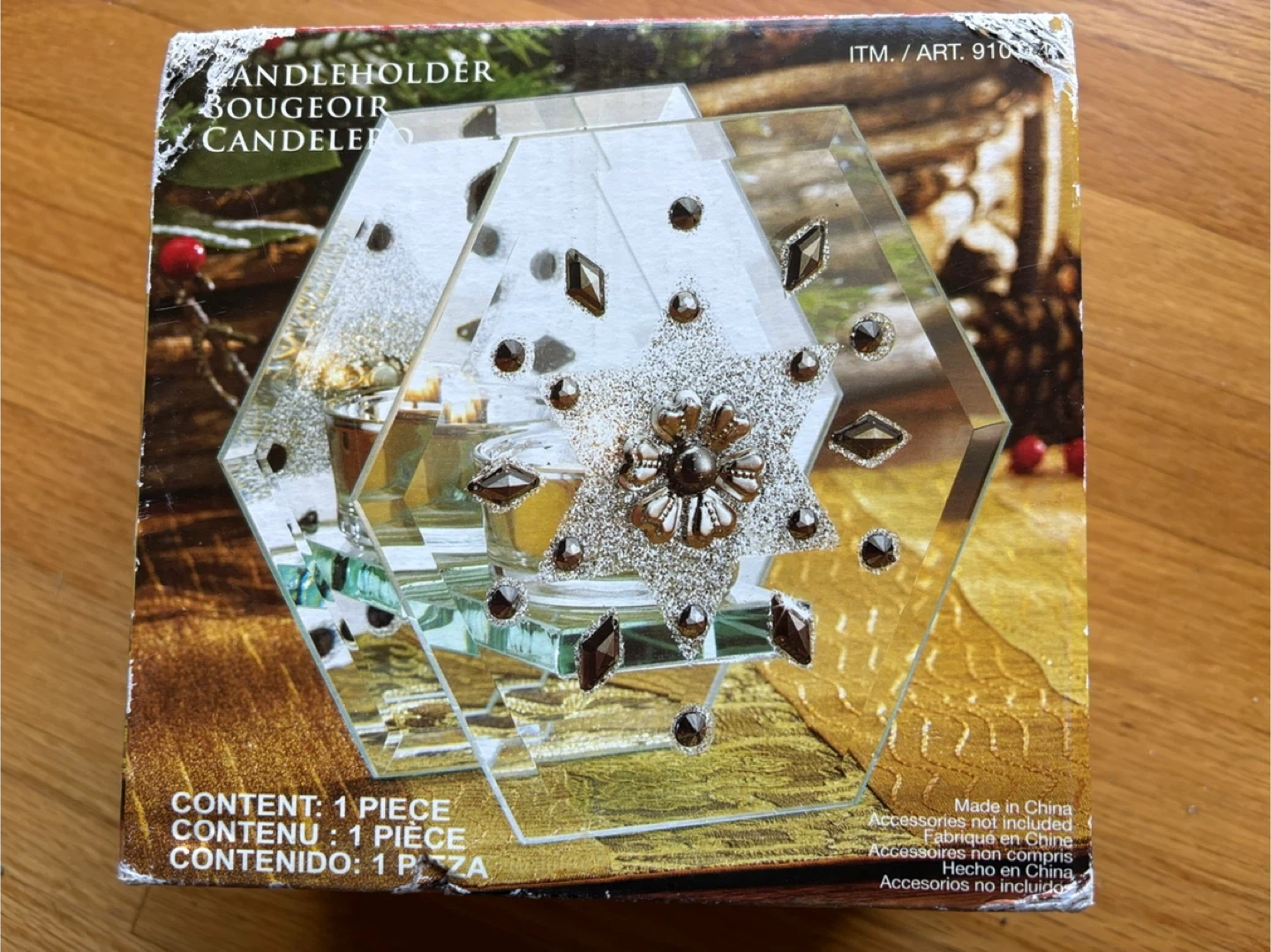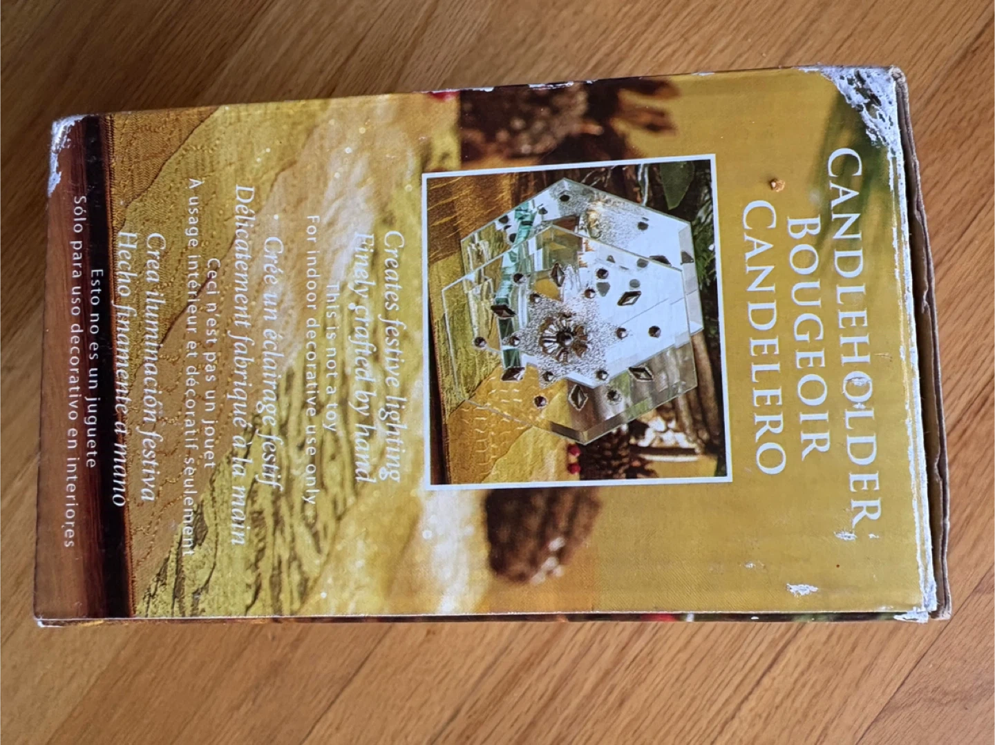 Selling a candleholder. It creates festive lighting and is finely crafted by hand. It's for indoor decorative use only. The box is included!