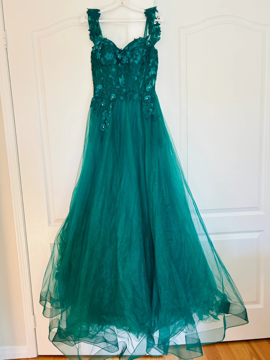Selling a beautiful Emerald Green formal dress size M - bought from Candy Prom & Evening. Worn only 1 time - Almost new - very well kept with original cover, packing and bill in smoke free and pet free clean home. Original price was $ 557(with tax) Asking price: $ 360 It's in excellent condition and ready for its next special occasion! The dress features delicate appliqués and floral straps.