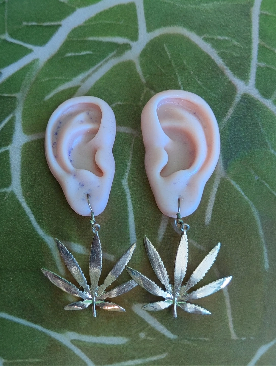 Quirky and fun cannabis earrings. used to wear them when I was a budtender and they were a hit! just never wear them anymore The leafs are a rustic sort of finish. the earring part is a little bit worn but can't tell when you're wearing it. also open to a trade, I love earrings (gold toned)