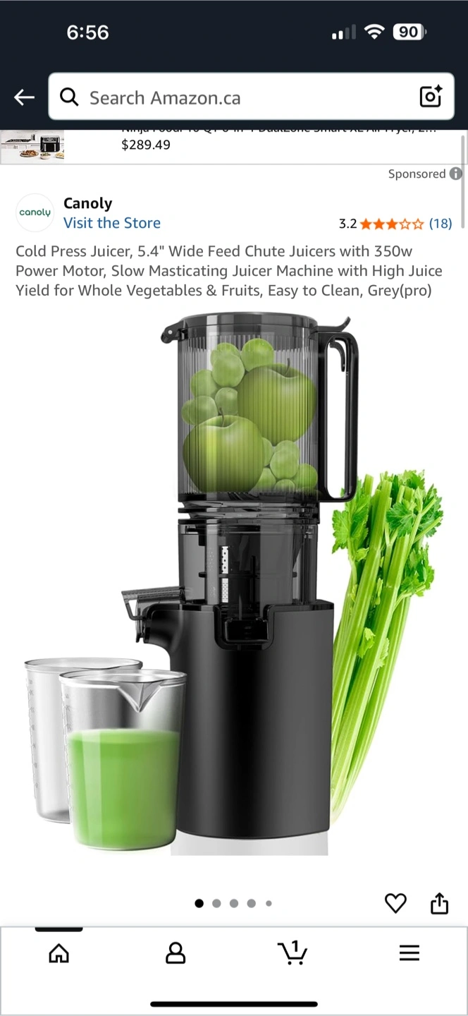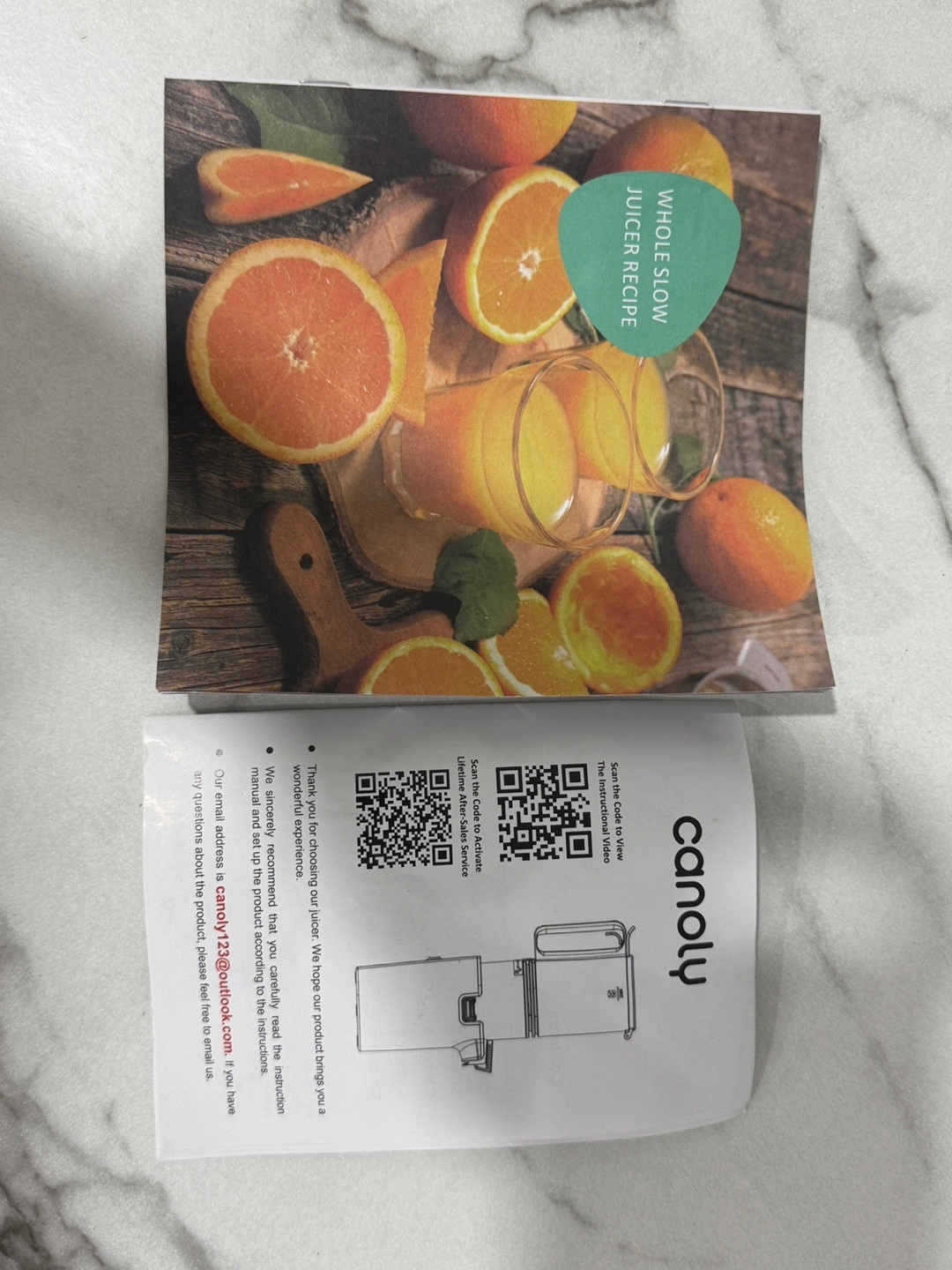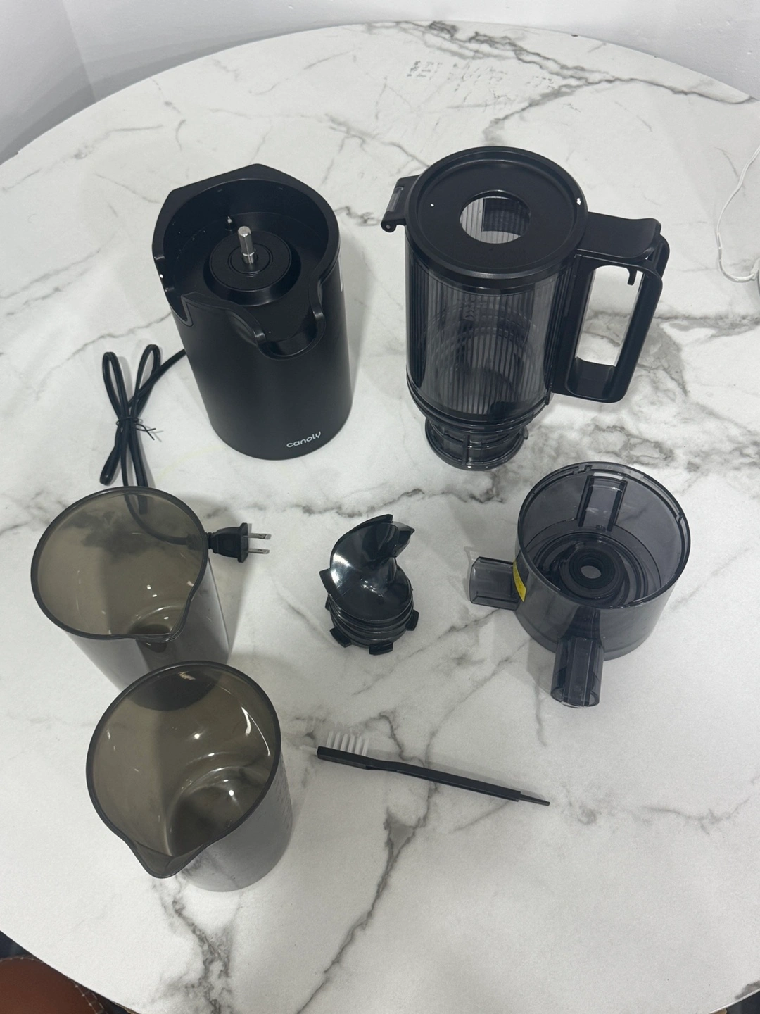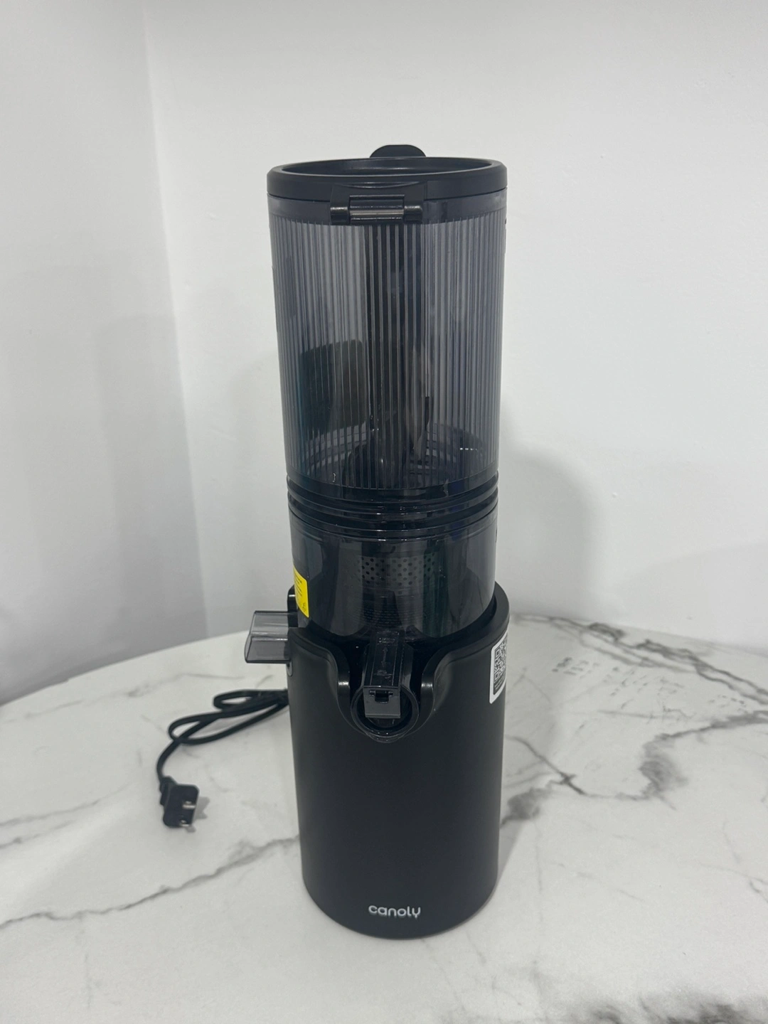 Selling a Canoly Cold Press Juicer in excellent condition! It features a 5.4" wide feed chute and a 350W power motor. It's great for making juice from whole vegetables and fruits and is easy to clean. Includes the cleaning brush and recipe book