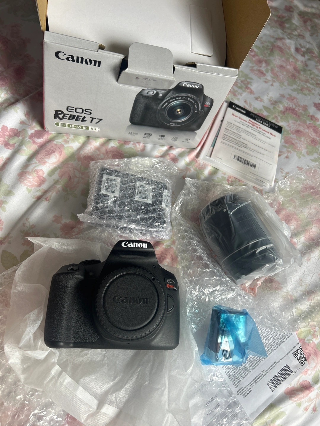 New Canon EOS Rebel T7 DSLR camera kit. Includes camera body, EF-S 18-55 III lens, and accessories. In original packaging.