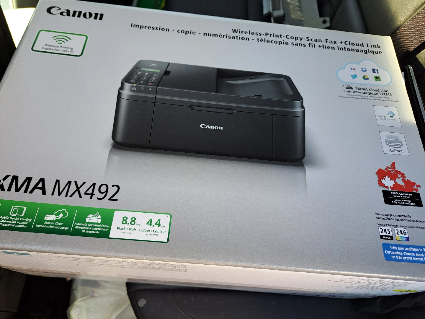 Selling a Canon PIXMA MX492 all-in-one printer. It features wireless printing, copying, scanning, and fax capabilities. It's also equipped with cloud link for easy access and mobile device printing support. The printer uses 245 and 246 ink cartridges. 100% Canadian service and support