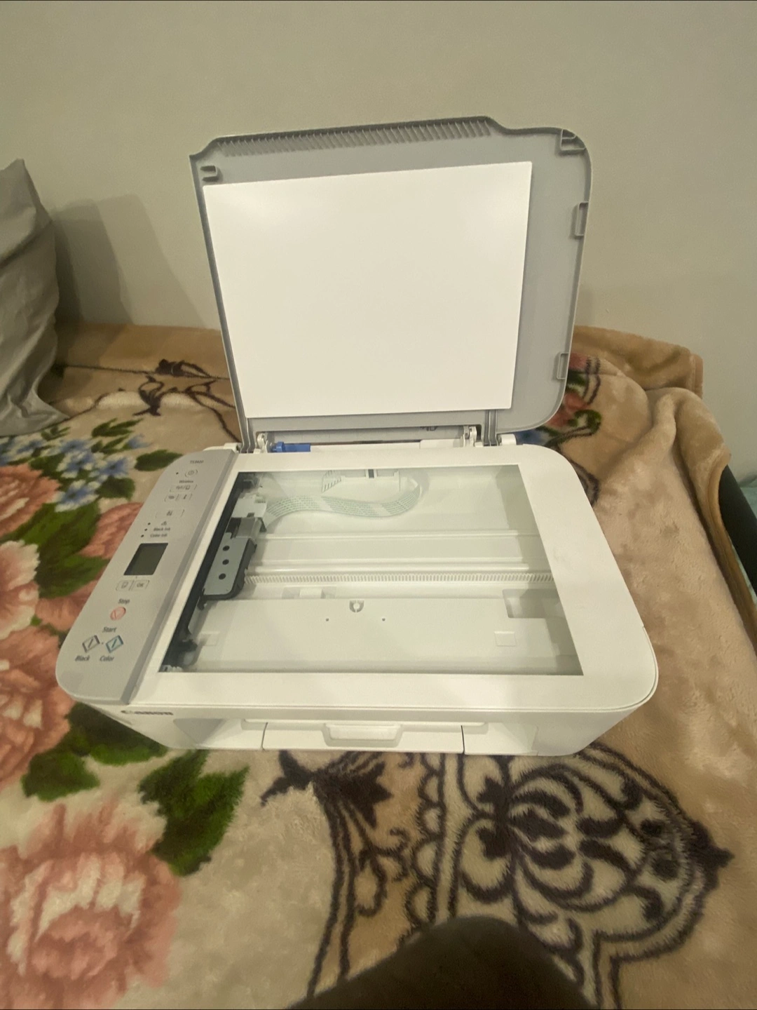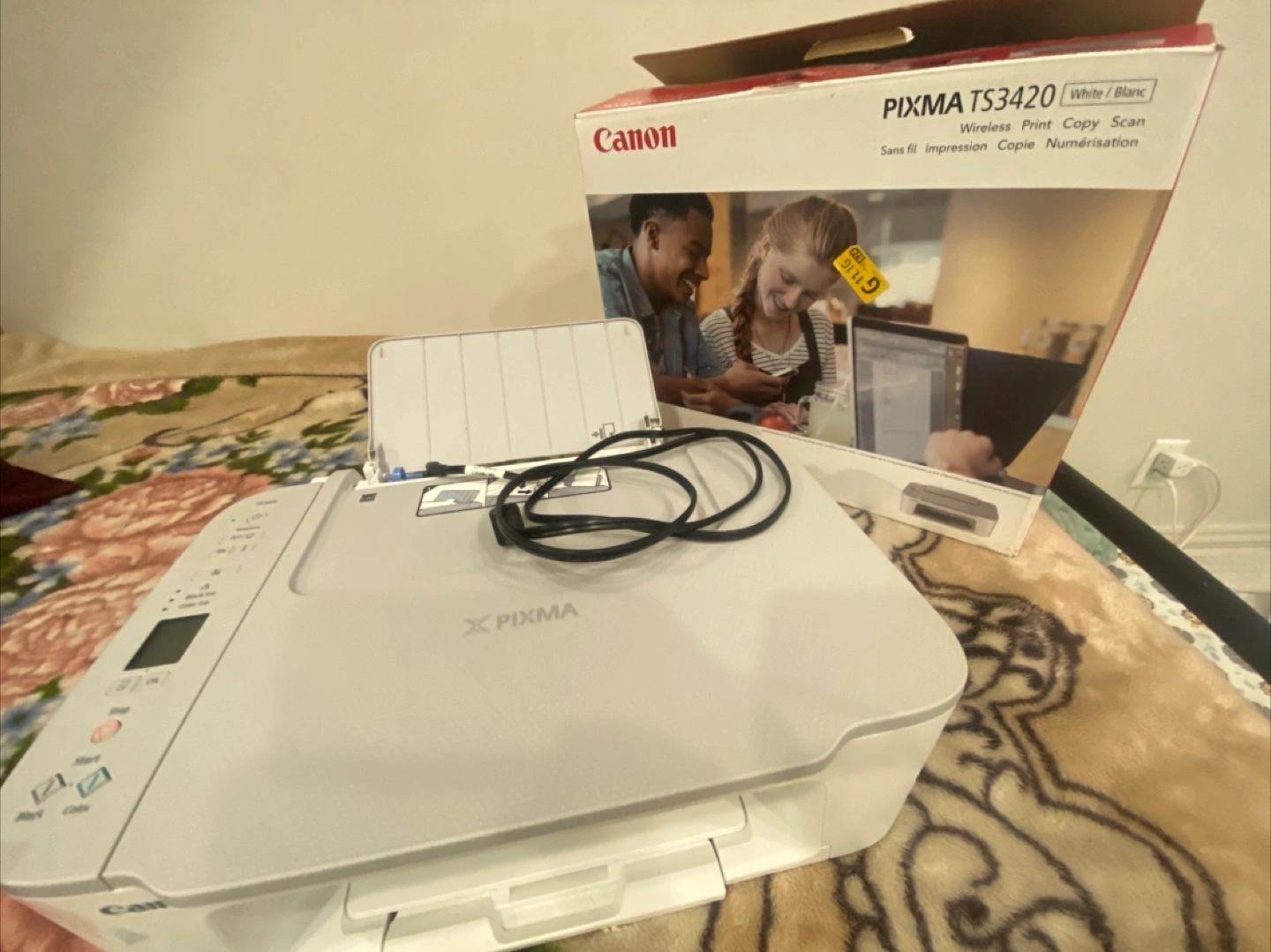 Selling a Canon PIXMA TS3420 wireless printer in white. It's in great condition and comes with the original box. Perfect for home or office use!