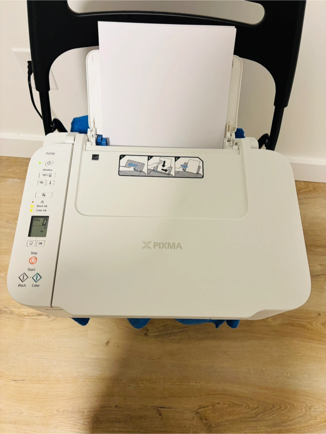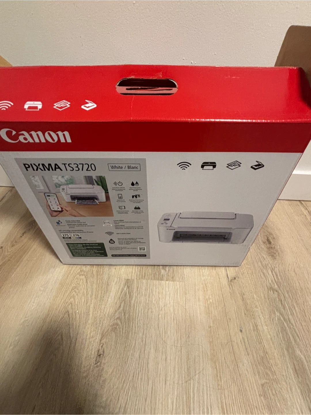 Selling a Canon PIXMA TS3720 printer in white. It's in great condition and comes with the original box. Perfect for home or office use! It's a great all-in-one printer for printing, scanning, and copying.