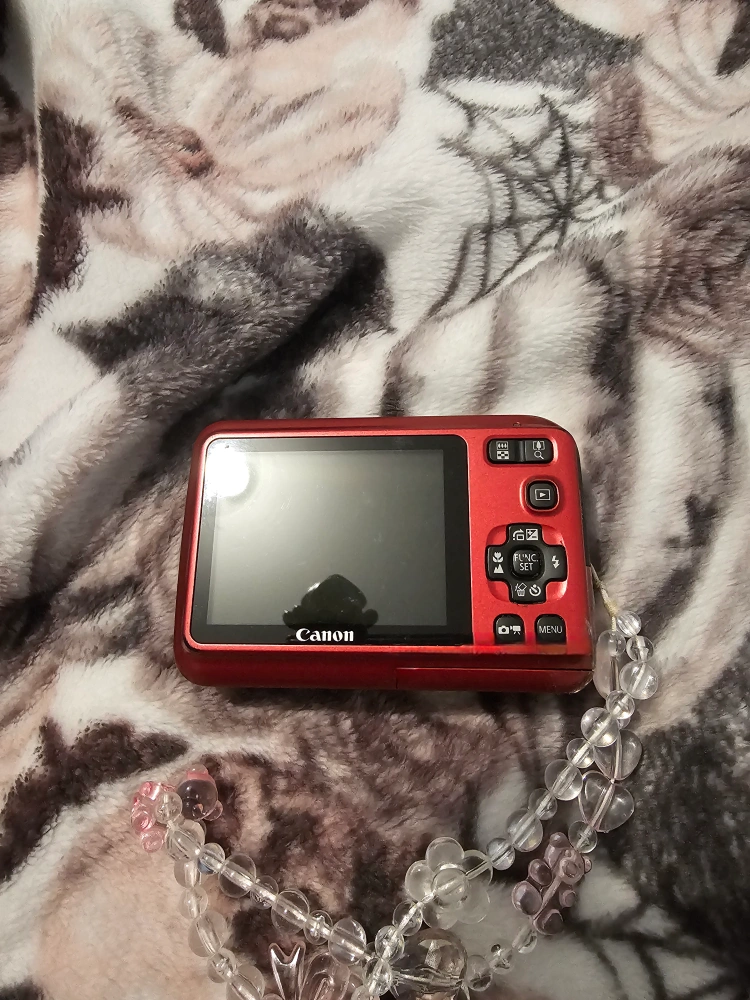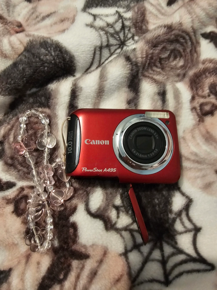 Selling a red Canon PowerShot A495 digital camera. It's a 10.0 megapixel camera with a zoom lens. Uses AA batteries and everything is perfect except for broken battery cover. It can be fixed with tape to hold it together. Comes with USB adapter to upload photos