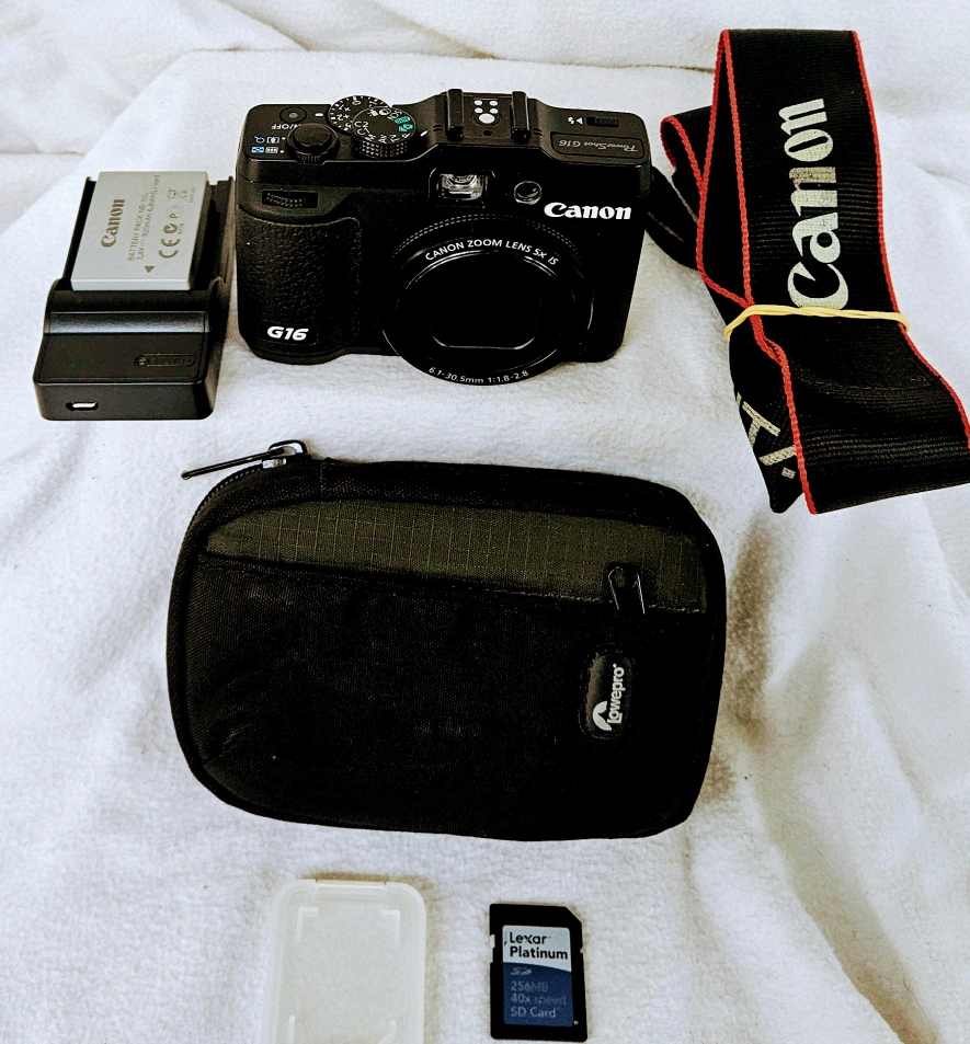 Canon PowerShot G16 12.1 MP CMOS Digital Camera with 1080p Full-HD Video Mint This Canon PowerShot G16 features 12.1 MP CMOS digital camera with 5X optical zoom and 1080p Full-HD video. This Canon PowerShot G16 is in excellent working cond. All electrical, digital and mechanical features, including the flash are in excellent working order. The large 3" LCD screen is in excellent working and cosmetic cond. there are no blemishes or missing pixels of any kind. Exterior of this 3" LCD screen show no scratches, chips or smudges of any kind. The exterior of this Canon PowerShot G16 is in absolute mint cond. There are no scratches, dents, chips or missing pieces of any kind. This Canon PowerShot G16 12.1 MP CMOS Digital Camera with 1080p Full-HD Video, comes with 2 batteries, battery charger, 128GB SD card, Canon neck strap and Lowepro carrying case. About this item Built-in Wi-Fi technology allows you to wirelessly transfer your images to social networking sites through CANON IMAGE GATEWAY Upload virtually anywhere on your iOS or Android device with free download of the Canon Camera Window app Capture breathtaking 1080p full HD video capture at 60fps and play back on an HDTV via the HDMI output 12.1 megapixel high-sensitivity 1/1.7-inch CMOS sensor combined with the Canon DIGIC 6.