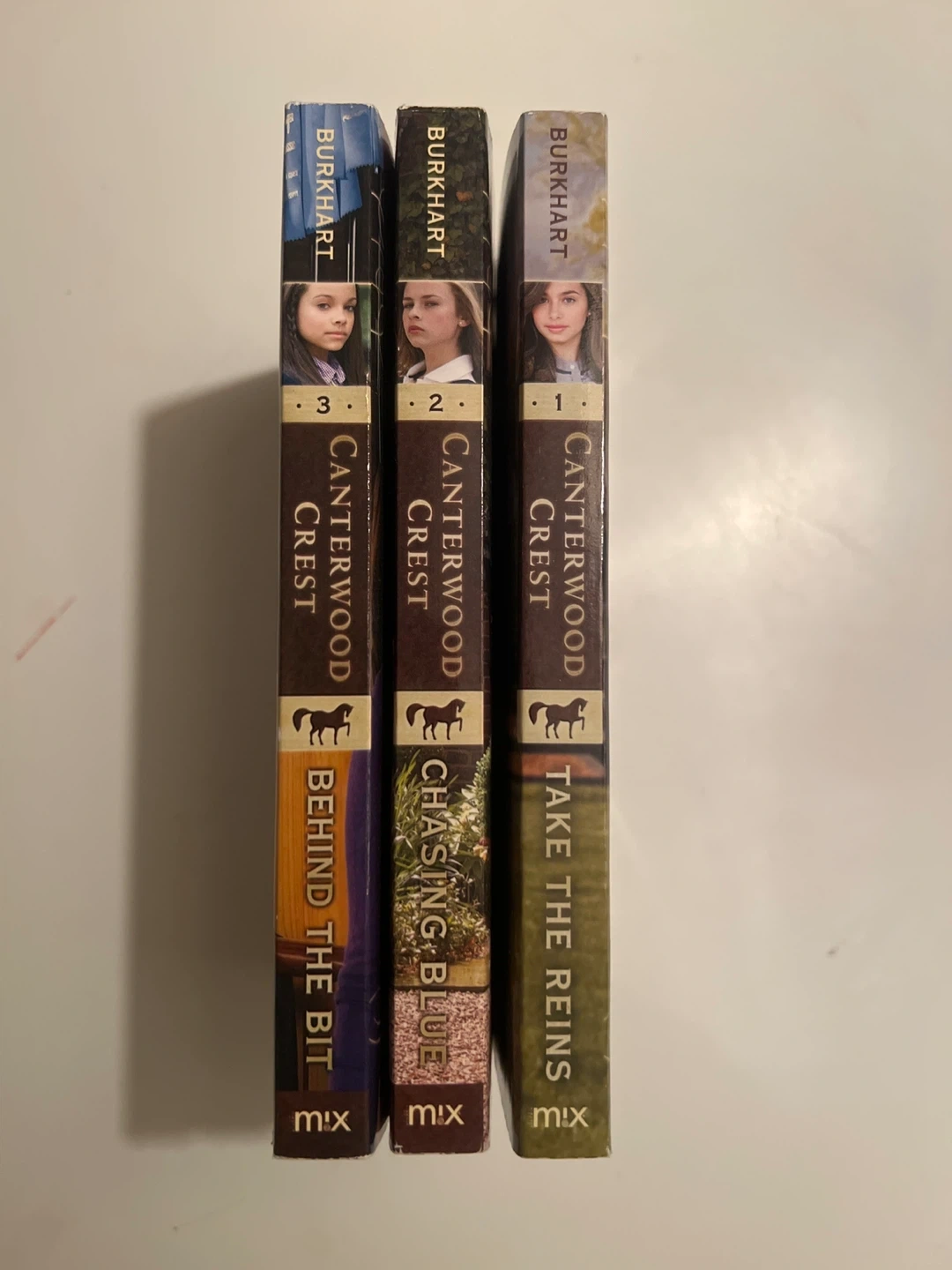Selling the first three books in the Canterwood Crest series by Jessica Burkhart! The books are: - Take the Reins (Book 1) - Chasing Blue (Book 2) - Behind the Bit (Book 3) Perfect for young readers who love horses and boarding school stories