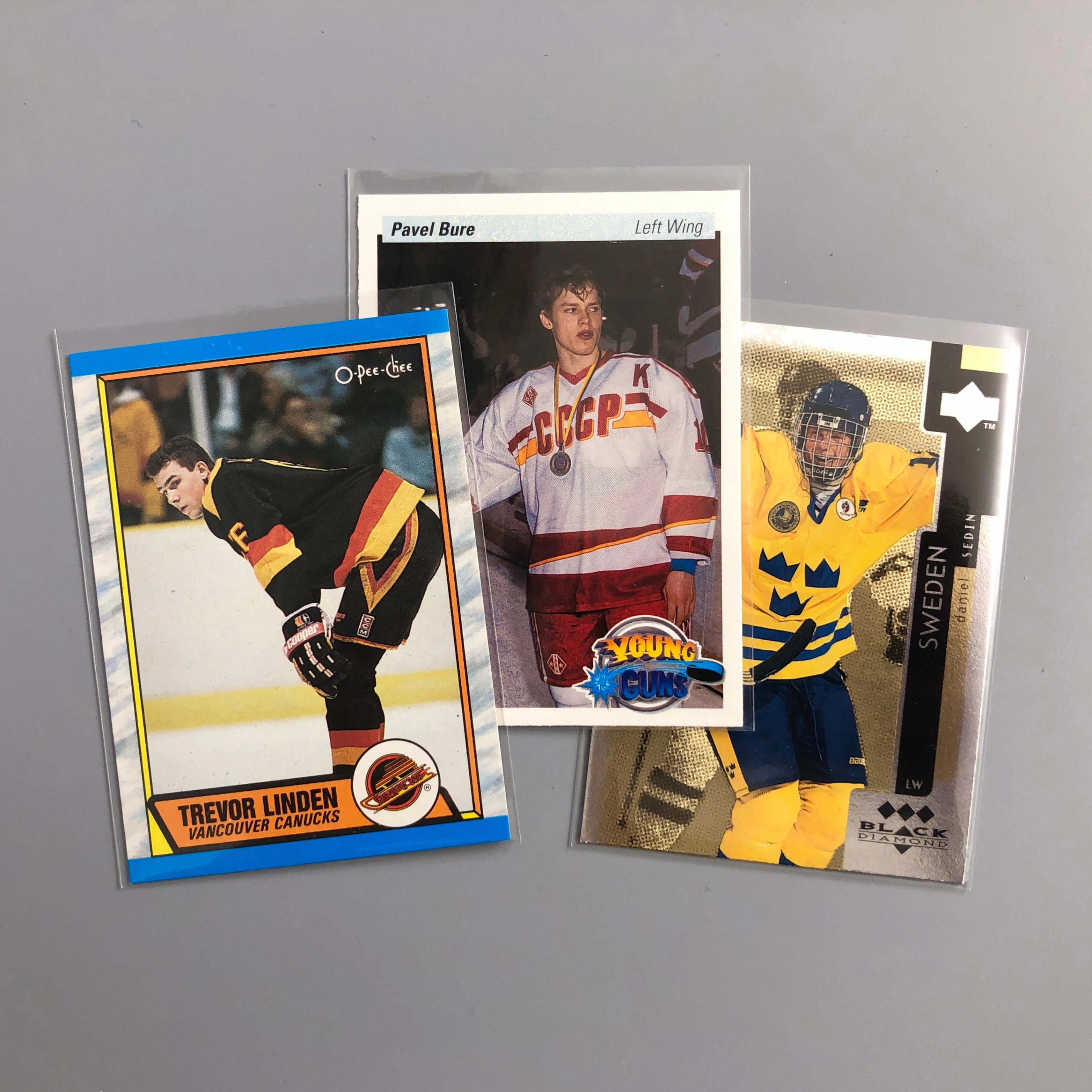 Lot of 3 Vancouver Canucks rookie cards. Includes rare Sedin Black Diamond triple diamond parallel RC, classic 1990 UD Pavel Bure Young Guns RC, and vintage 1989 Trevor Linden O-Pee-Chee RC all in great shape. We're slowly starting to list a lot of cool old vintage hockey cards, and they're selling fast, so our prices so far have been seen as very reasonable! Follow us! Tags: Vancouver, Canucks, rookie, cards, hockey card, RC, Young Guns, Sedin, Bure, Linden, 1989, 1990, 1997, NHL, legends, HOF, all star, vintage, Black Diamond, Upper Deck,