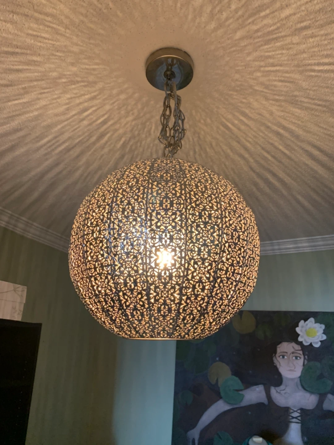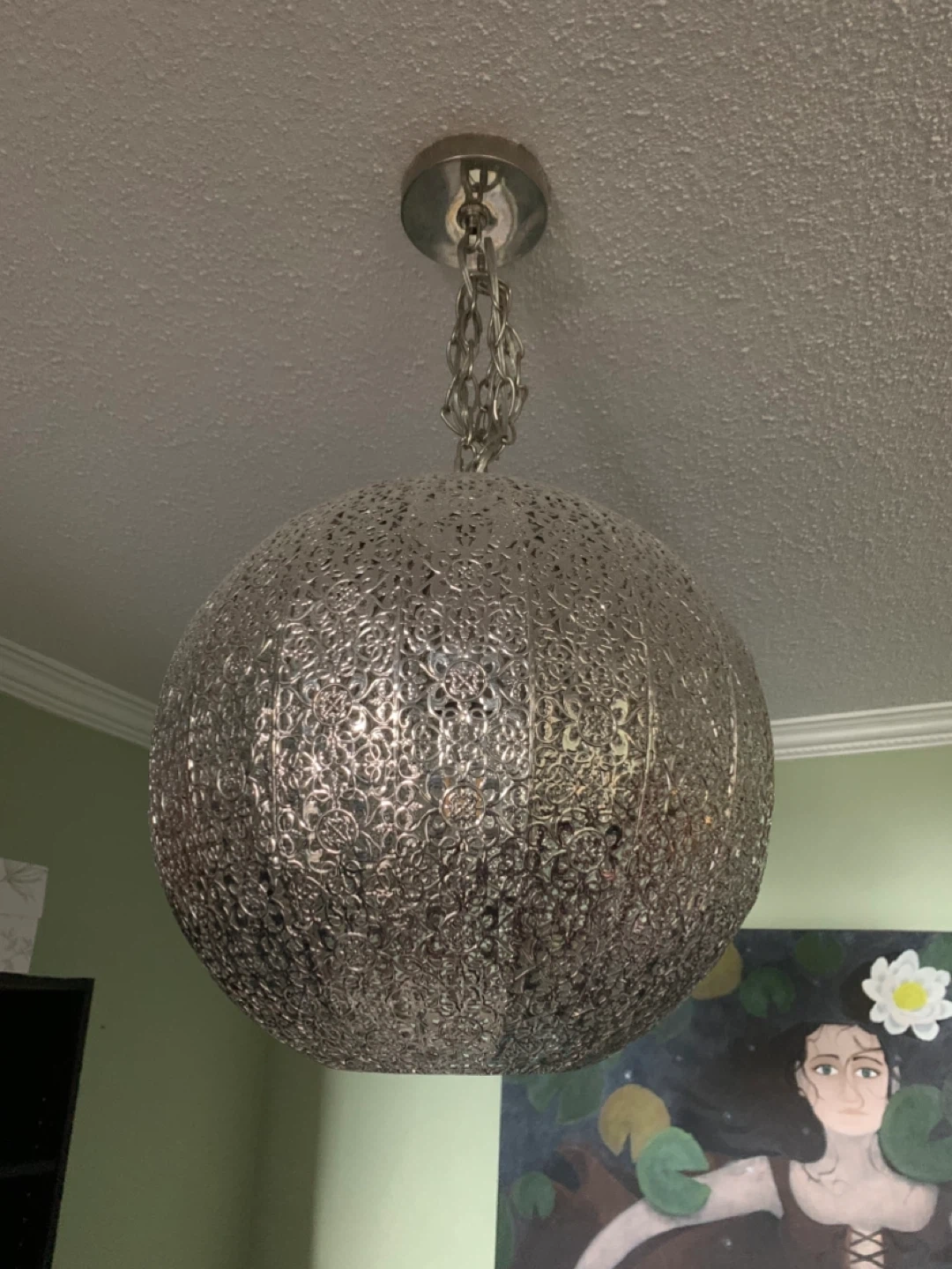 Canvas 1 light pendant, polished nickel finish with flower pattern. 16 1/8 inch by 22 inches, drop height is 22 to 55 inches. New in box, never used. (I have two)