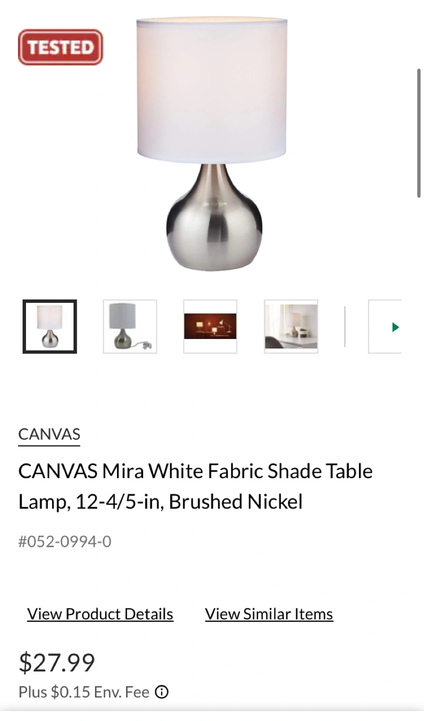 CANVAS Mira White Fabric Shade Table Lamp, 12-4/5-in, Brushed Nickel base. New condition! Sells online for $27.99 plus tax. Asking $20 This metal lamp features a simple design in brushed nickel with a white fabric shade that will lend a touch of elegance to contemporary decorating schemes. Create an ambient glow on a living room side table or to add soft light to your bedroom as a bedside lamp. Perfect for a bedside table or desk. Total height is 13 inches. Shade width is approximately 7 1/2 inches. —-///—-///—-///—-///—-///—- Check out my other ads for more great deals! Thanks for looking! —-///—-///—-///—-/// —-///—-