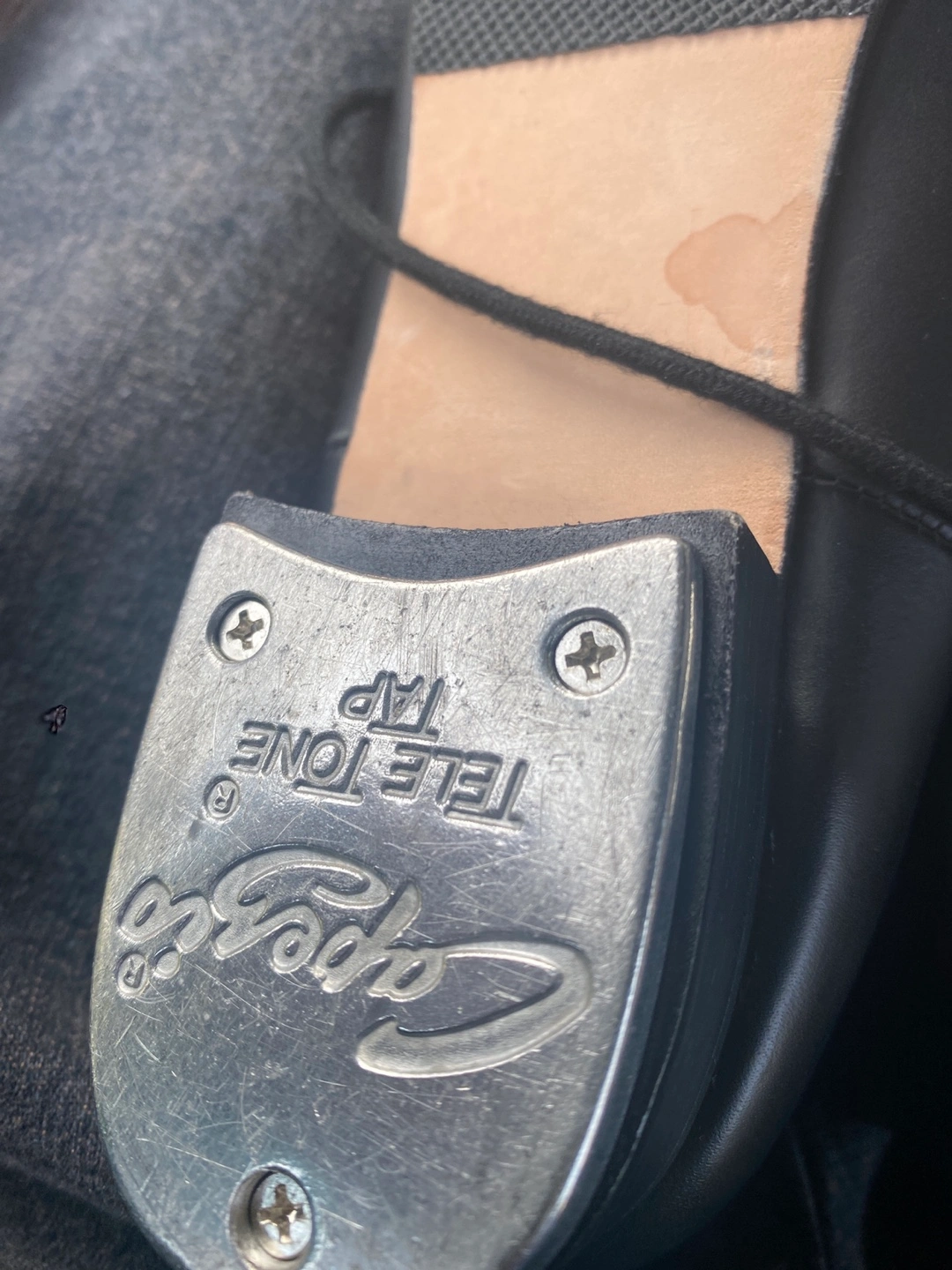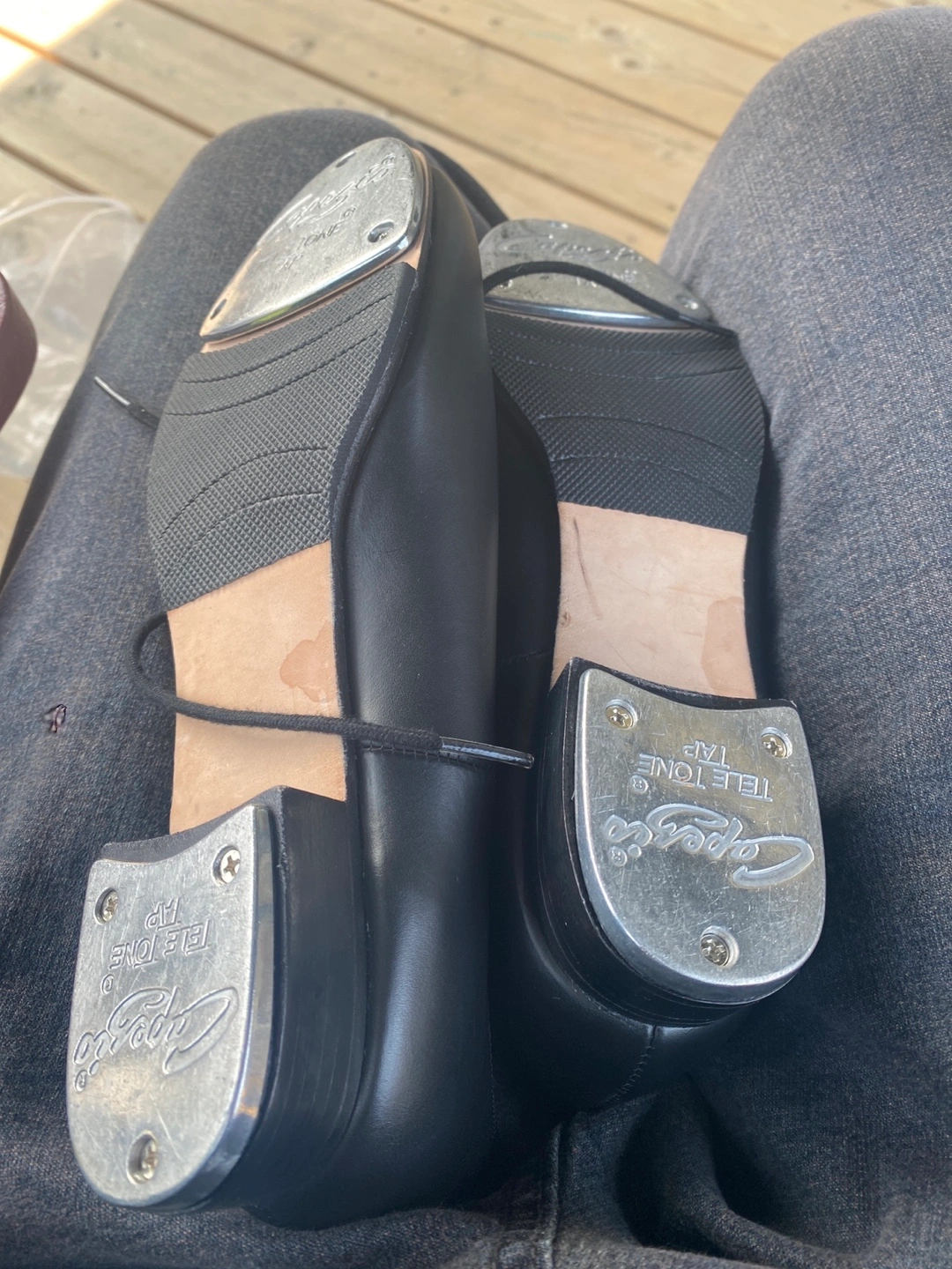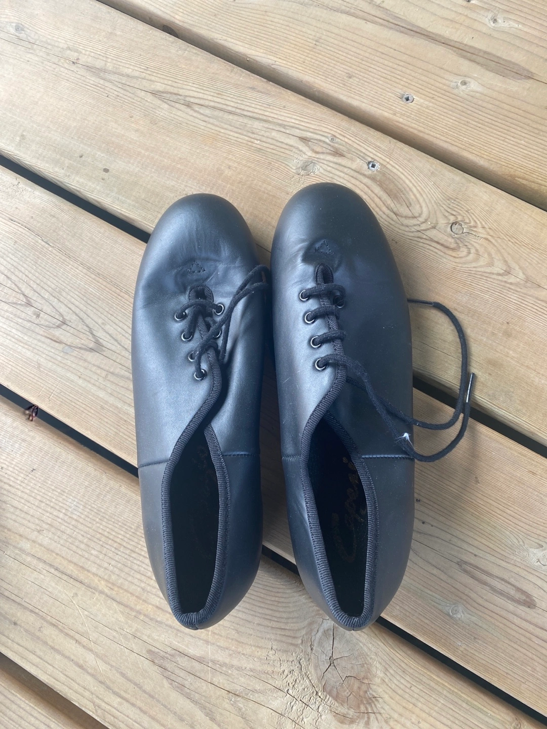 Black tap shoes. Laces and tap plates. Made of leather. A good use for these shoes is expressing yourself.size 81/2 M pick up In Pickering π