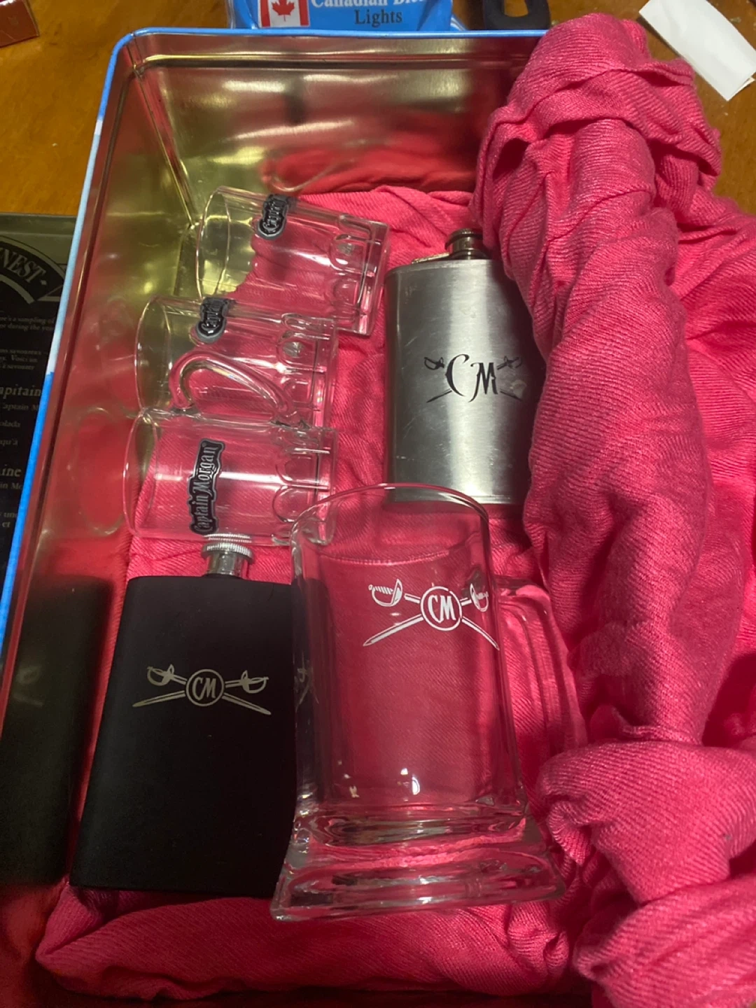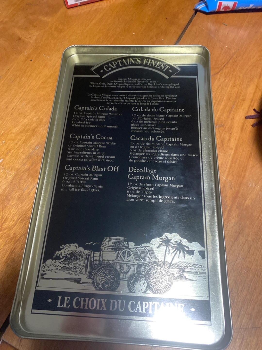 Captain Morgan bar set, perfect for your home bar! Includes: - 4 Captain Morgan glasses - 2 Captain Morgan flasks Comes in the original tin, which also has some fun cocktail recipes on the inside