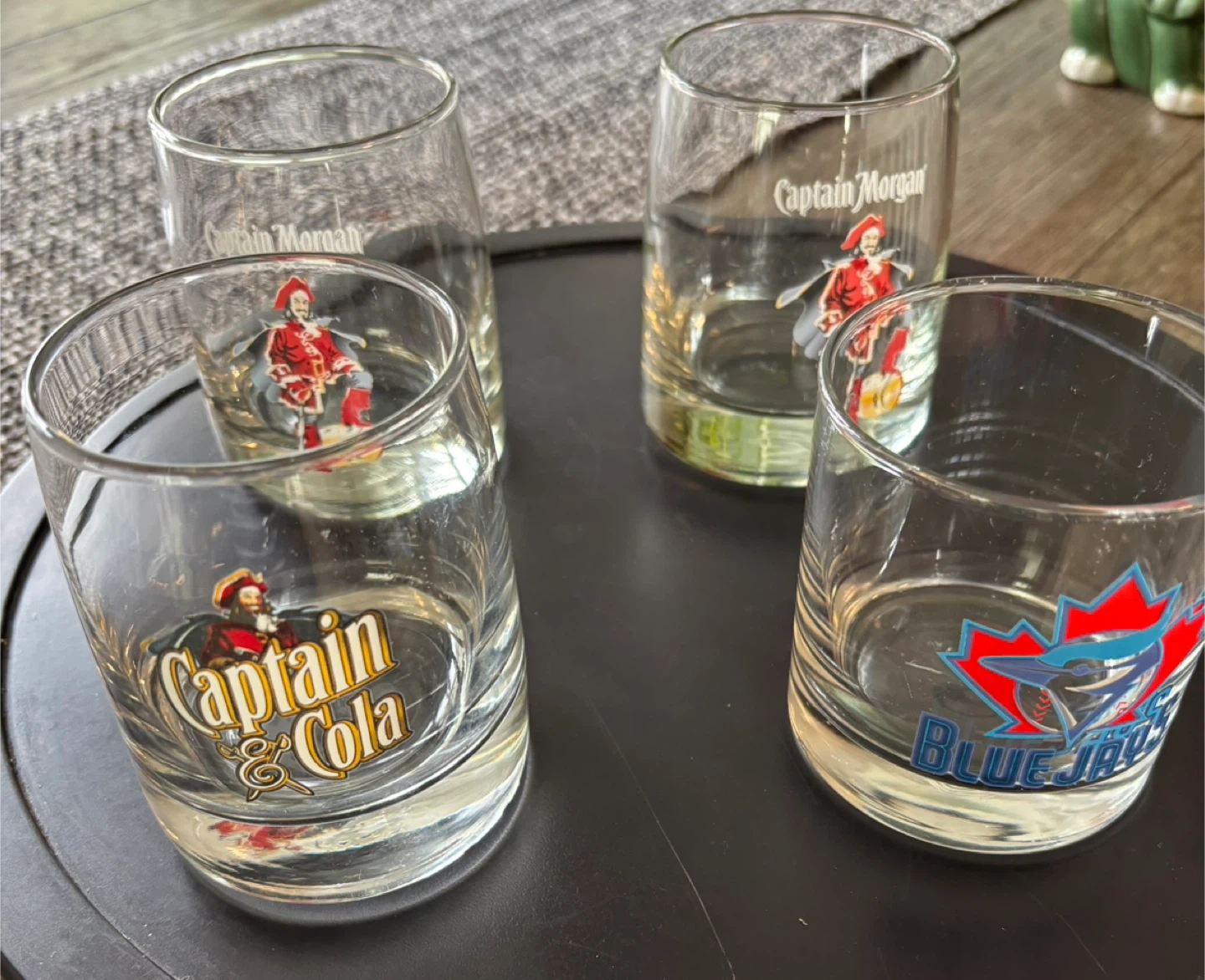 Selling a set of four shot glasses. Two are Captain Morgan branded, one is Captain & Cola, and the last one is Toronto Blue Jays