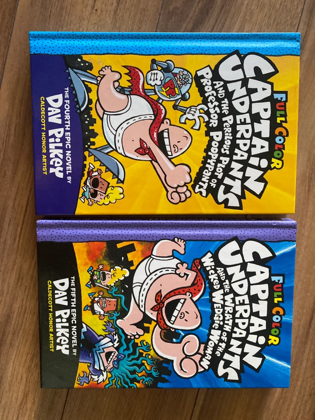 Selling two Captain Underpants books by Dav Pilkey! This set includes: - Captain Underpants and the Perilous Plot of Professor Poopypants (The Fourth Epic Novel) - Captain Underpants and the Wrath of the Wicked Wedgie Woman (The Fifth Epic Novel) Both books are in full colour and are great for kids! Both for 15