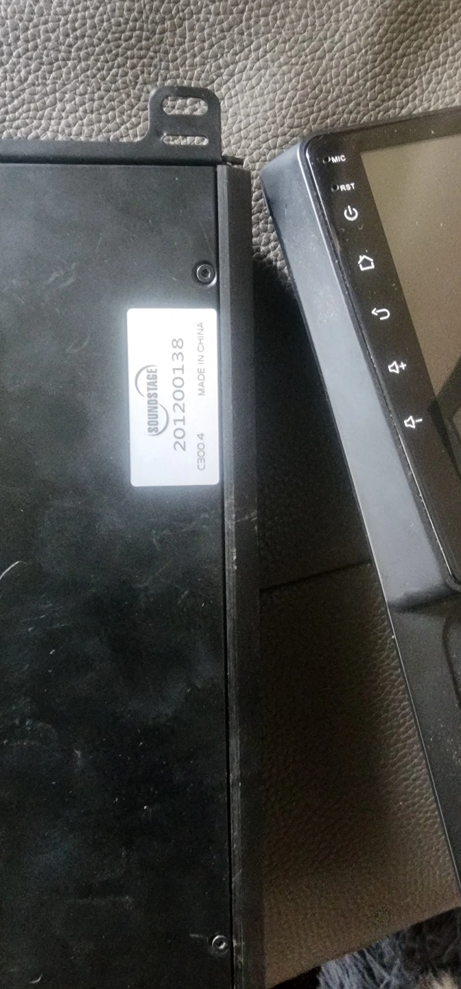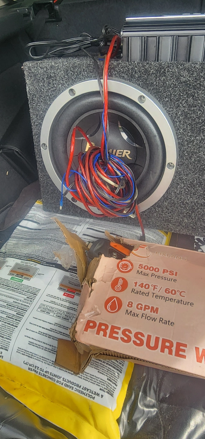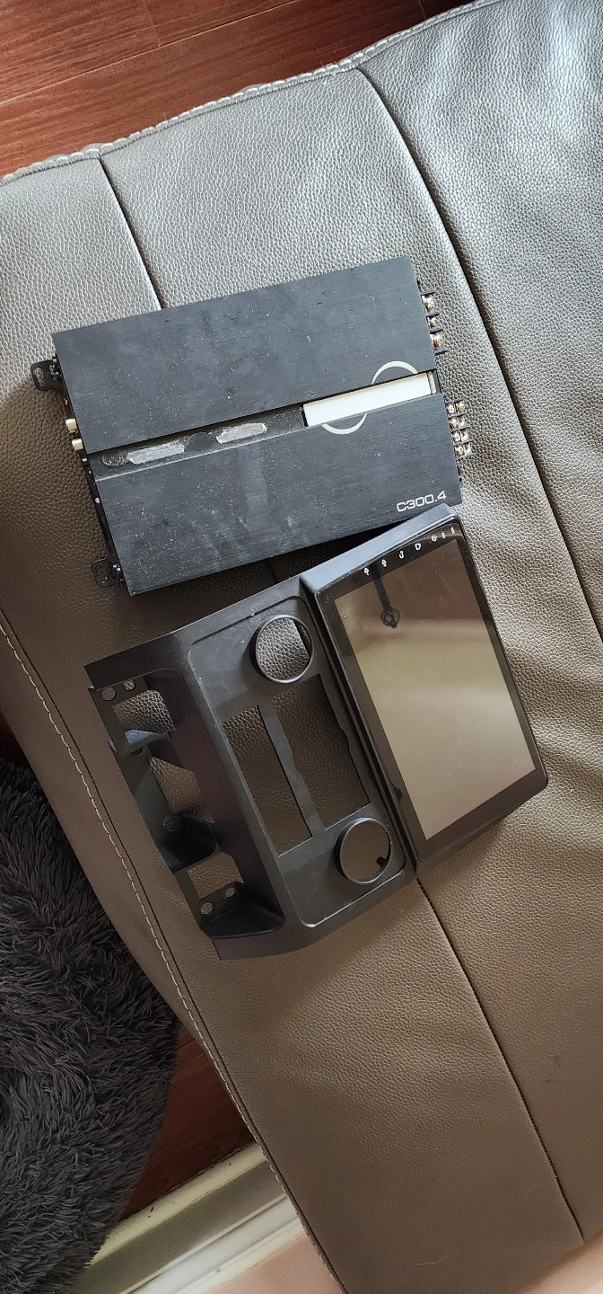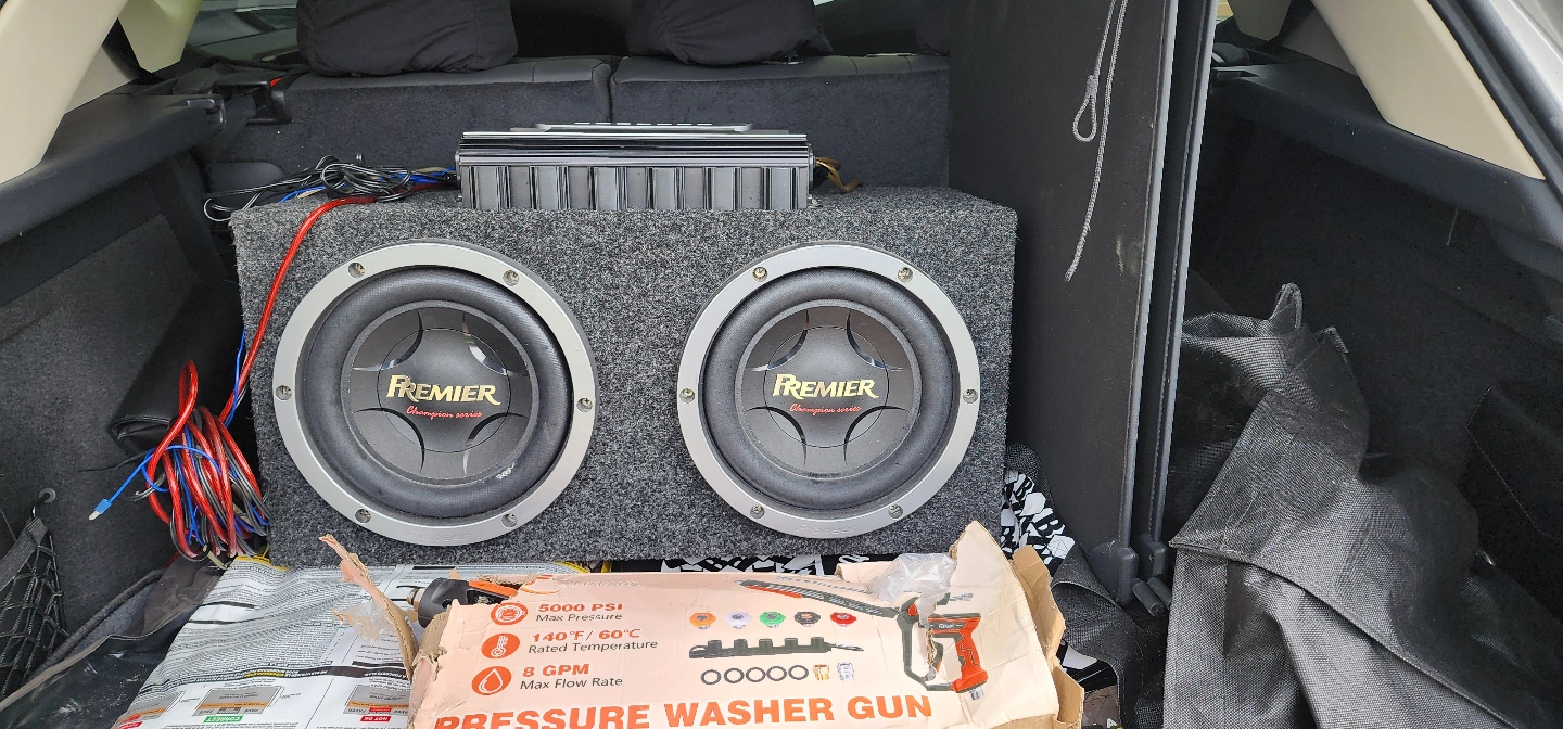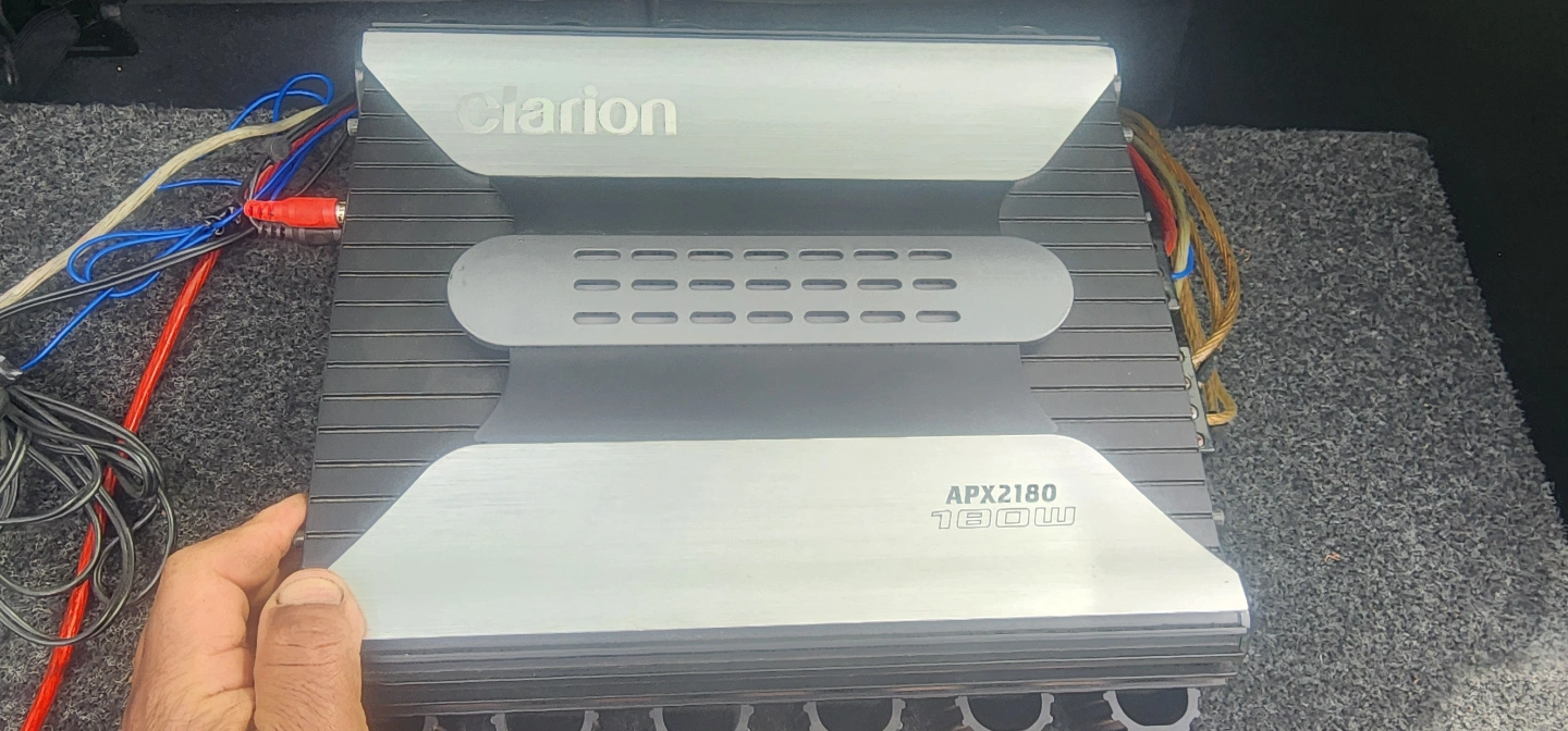 car audio components. Includes Clarion APX2180 180W amplifier, two Premier subwoofers in a custom enclosure, and a double din car stereo. Wiring harness included. Sold as is.