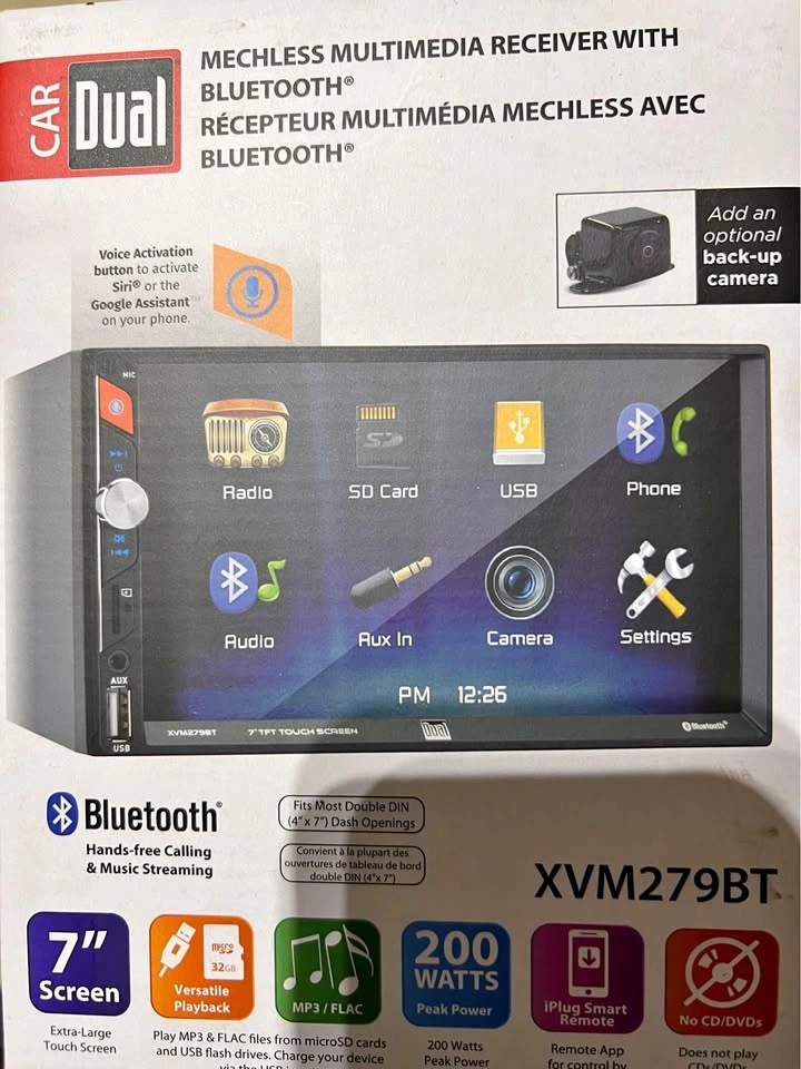 Brand new car multimedia. The 7-inch LED Backlit LCD High Resolution Touch Screen display provides you with a comfortable viewing experience and is extremely responsive. Music streaming will allow you to view and control your Pandora, iHeartRadio and Spotify apps from the home screen while also allowing you to stream wirelessly music from your Apple, Android or Media devices including any stored music. To give you more control over your music experience we included an AM/FM Tuner with 30 Station Presets (18FM/12AM) and 7 EQ (Pop, Jazz, Classic, Rock, Beat, Flat and User) •Built-in Bluetooth with hands-free calling and audio streaming •Easy access voice activation button to activate Siri® or the Google Assistant™ on your phone •Programmable on-screen shortcut to smartphone navigation app •Dual iPlug Smart Remote app via Bluetooth (Apple®/Android™) •AM/FM Tuner with 30 station presets (18FM/12AM) •Short depth chassis for easy installation •7” High resolution LCD touchscreen •Digital media receiver, does not play CDs/DVDs •Supports audio only, no video playback •Front microSD card slot •Front USB input with 1A charging •Front 3.5mm aux input •Back-up camera input •File playback: MP3 & FLAC •1 Pair of RCA preamp outputs (Front or Rear) •7 Preset EQ curves (Pop, Jazz, Rock, Flat, Classic, Beat, & User) •200 Watts max power (50W x 4)