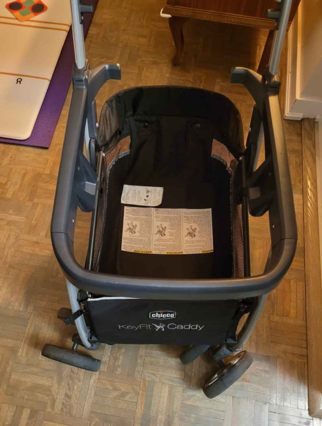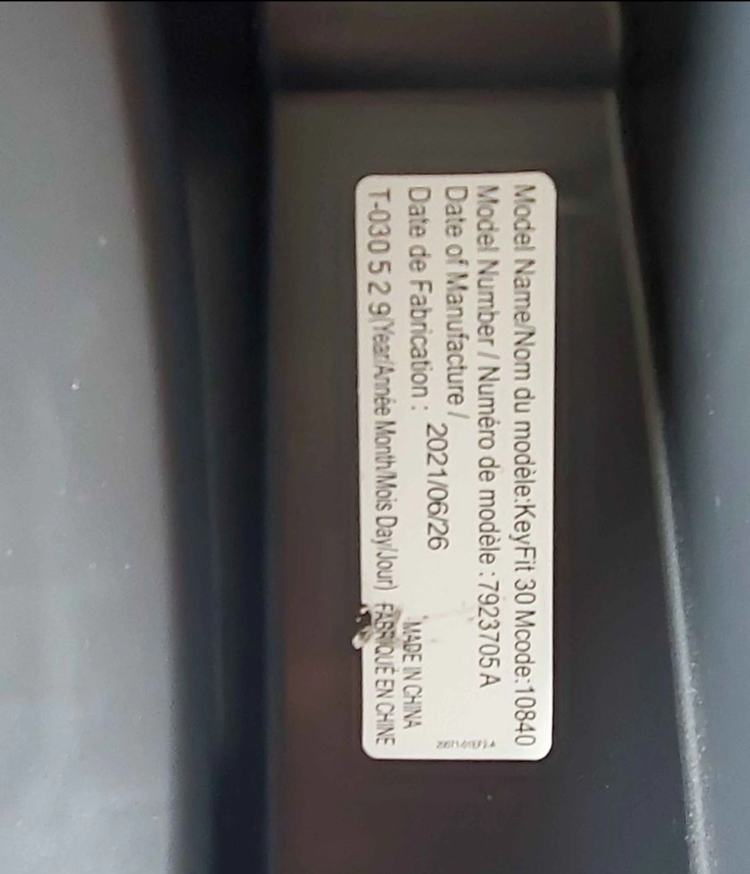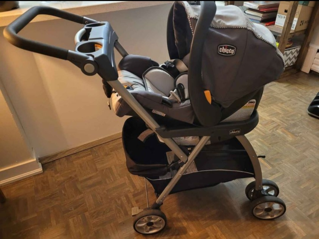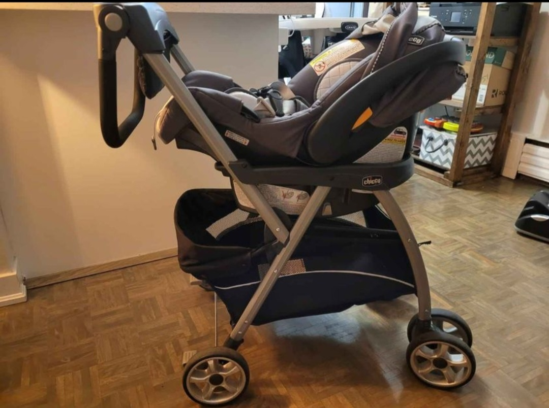 Chicco Key Fit 30 Infant Car Seat with infant insert and base - used for less than 1 year and in good condition. Manufactured 2021/06/26 Rear-facing for infants 4-30 lbs, up to 30" Chicco KeyFit Caddy Frame Stroller inculeded. The Caddy accepts all KeyFit infant car seats with easy click-in attachment. The lightweight aluminum frame weighs 11 lbs. Oversized expandable basket with front/rear access; parent tray with two cup holders and storage compartment; padded handle with 4 height positions All-wheel suspension and front swivels for a smooth ride; toe-tap rear brakes for parking.