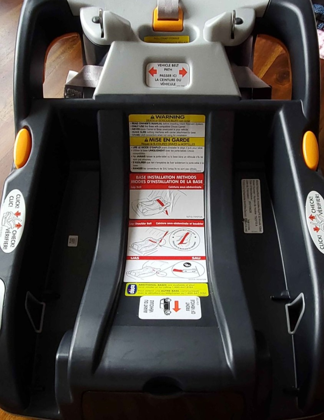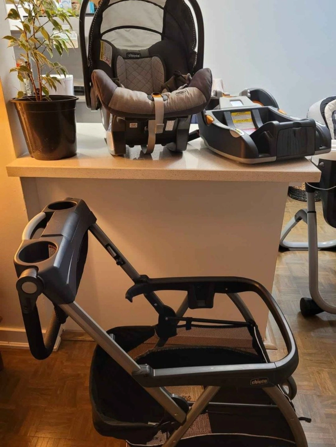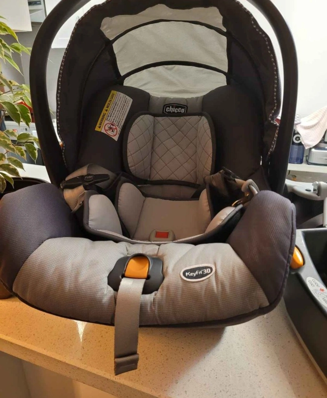 Chicco Key Fit 30 Infant Car Seat with infant insert and base - used for less than 1 year and in good condition. Manufactured 2021/06/26 Rear-facing for infants 4-30 lbs, up to 30" Chicco KeyFit Caddy Frame Stroller inculeded. The Caddy accepts all KeyFit infant car seats with easy click-in attachment. The lightweight aluminum frame weighs 11 lbs. Oversized expandable basket with front/rear access; parent tray with two cup holders and storage compartment; padded handle with 4 height positions All-wheel suspension and front swivels for a smooth ride; toe-tap rear brakes for parking.