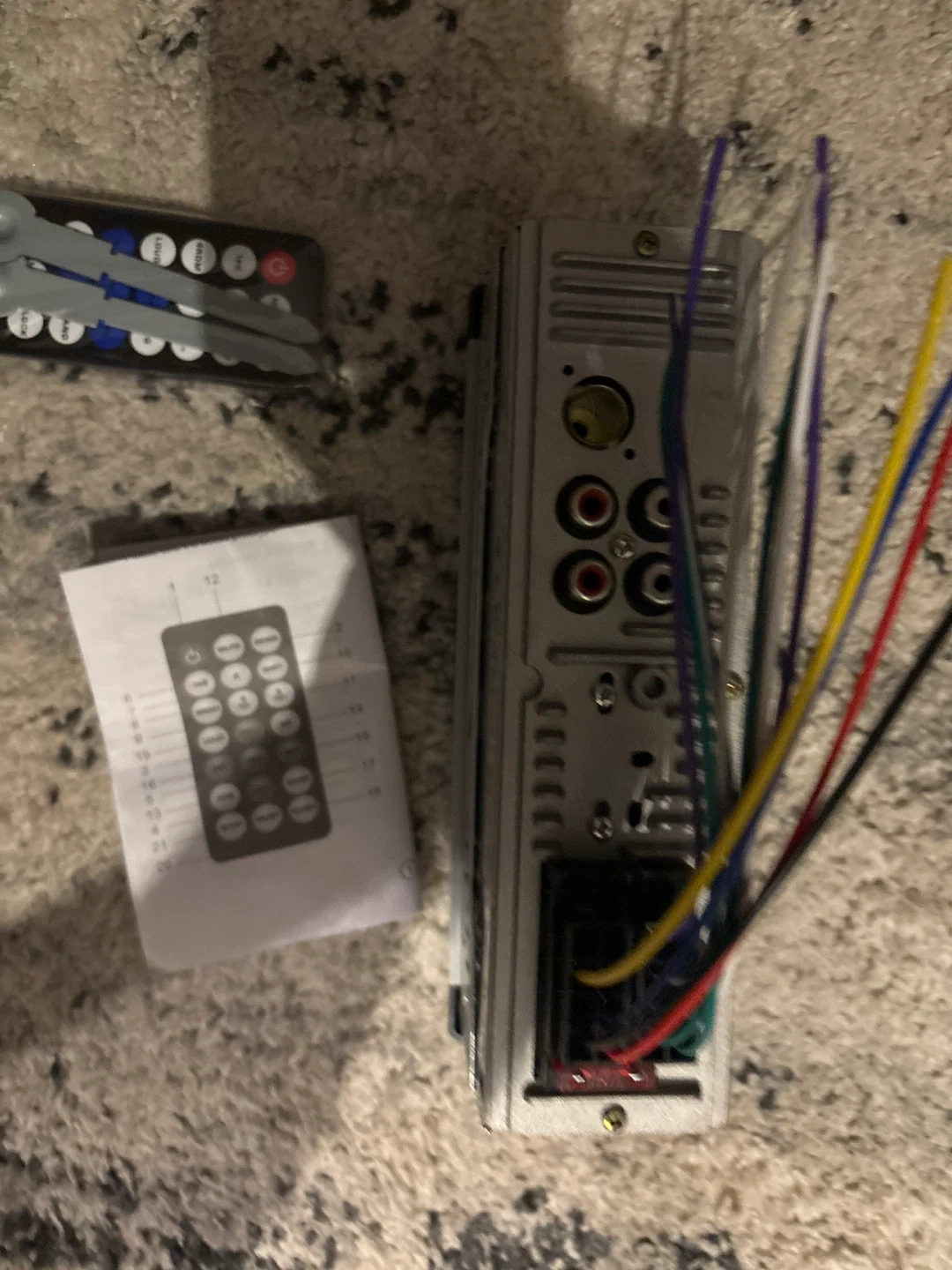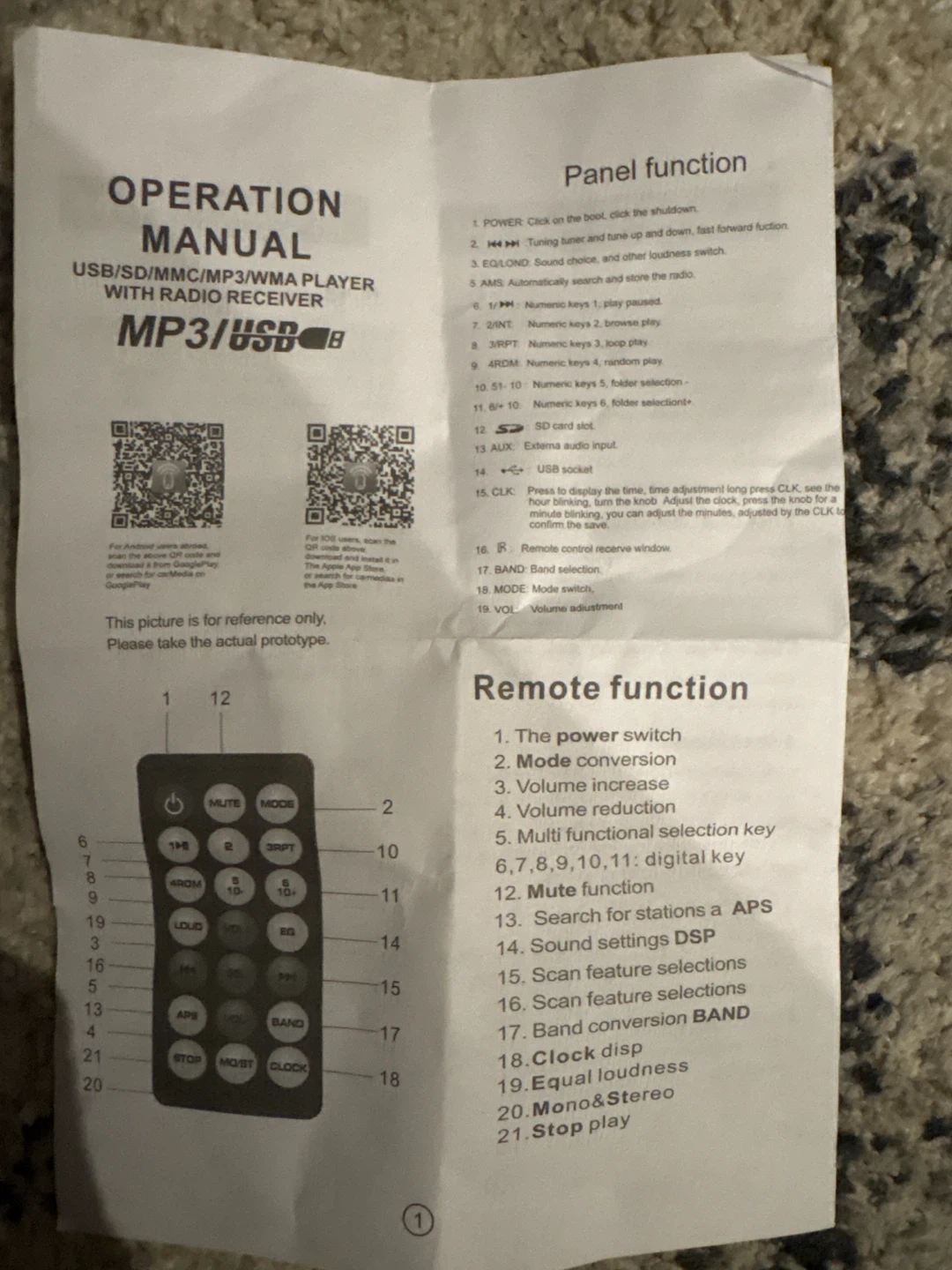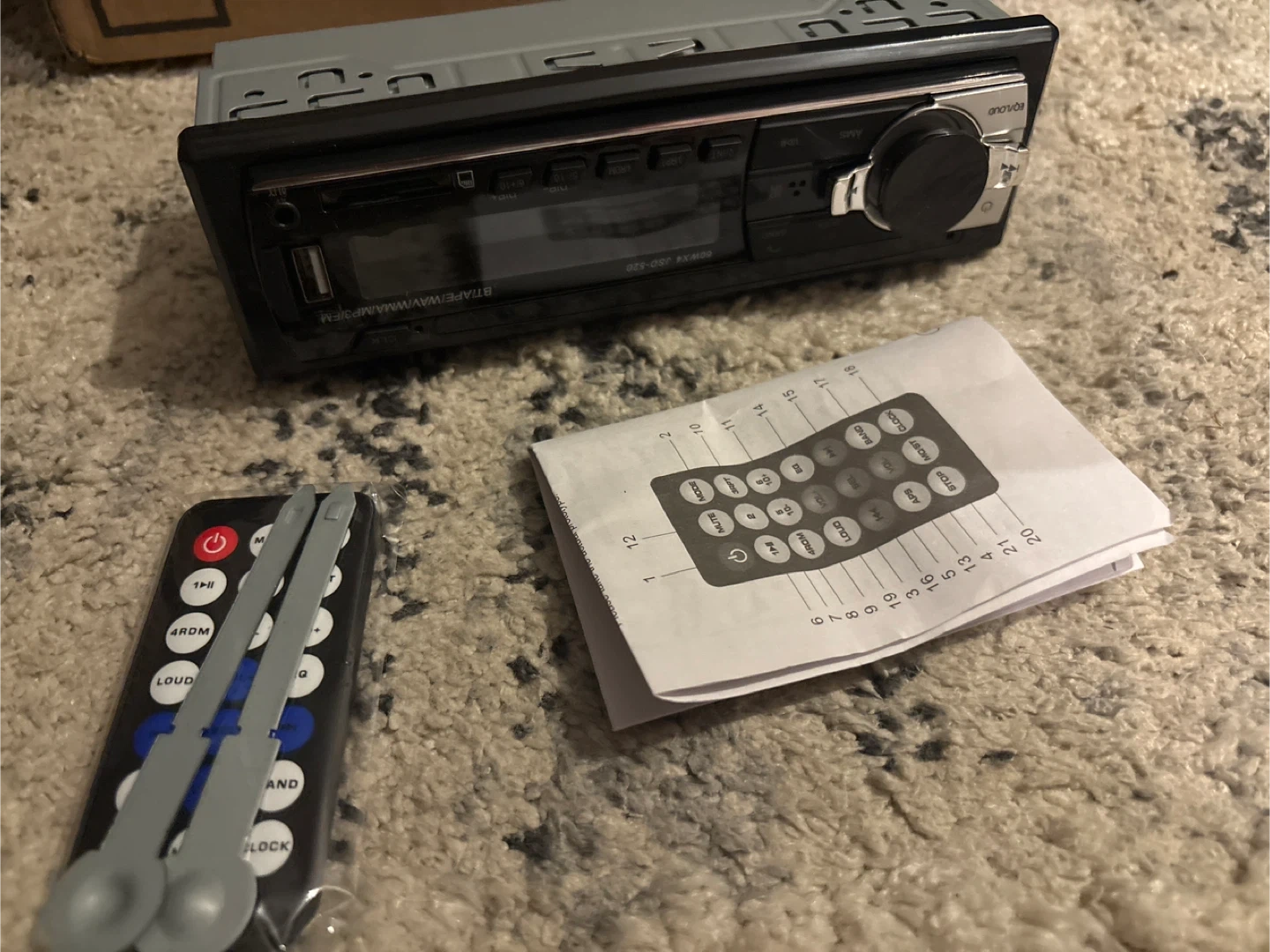 Car stereo receiver for playing your favourite tunes! It supports USB, SD, MMC, MP3, and WMA formats. Comes with a remote control and operation manual for easy setup and use. Get ready to upgrade your car audio system!