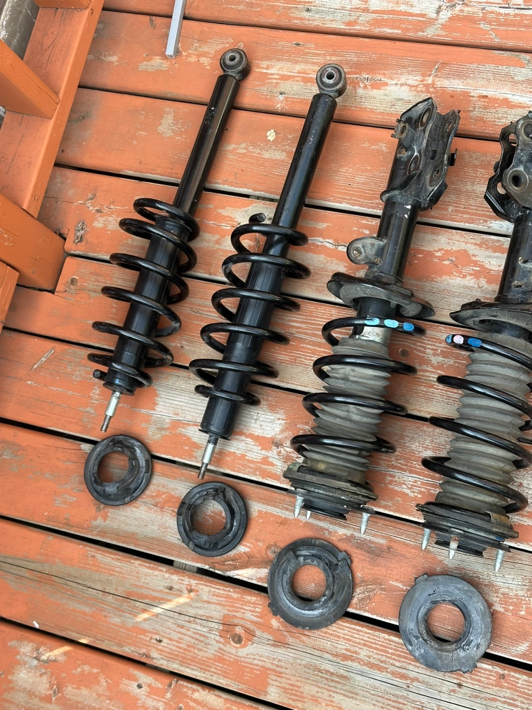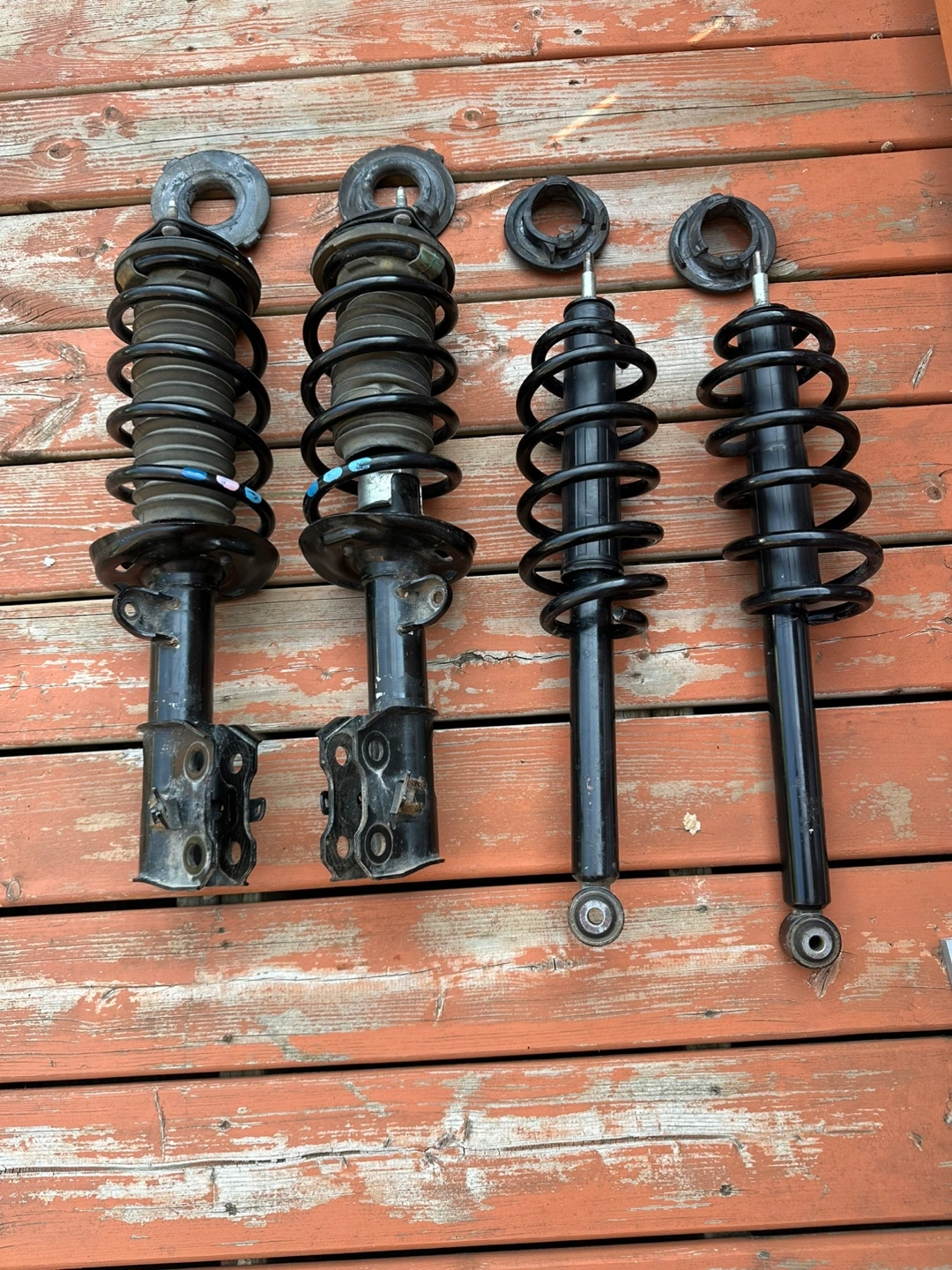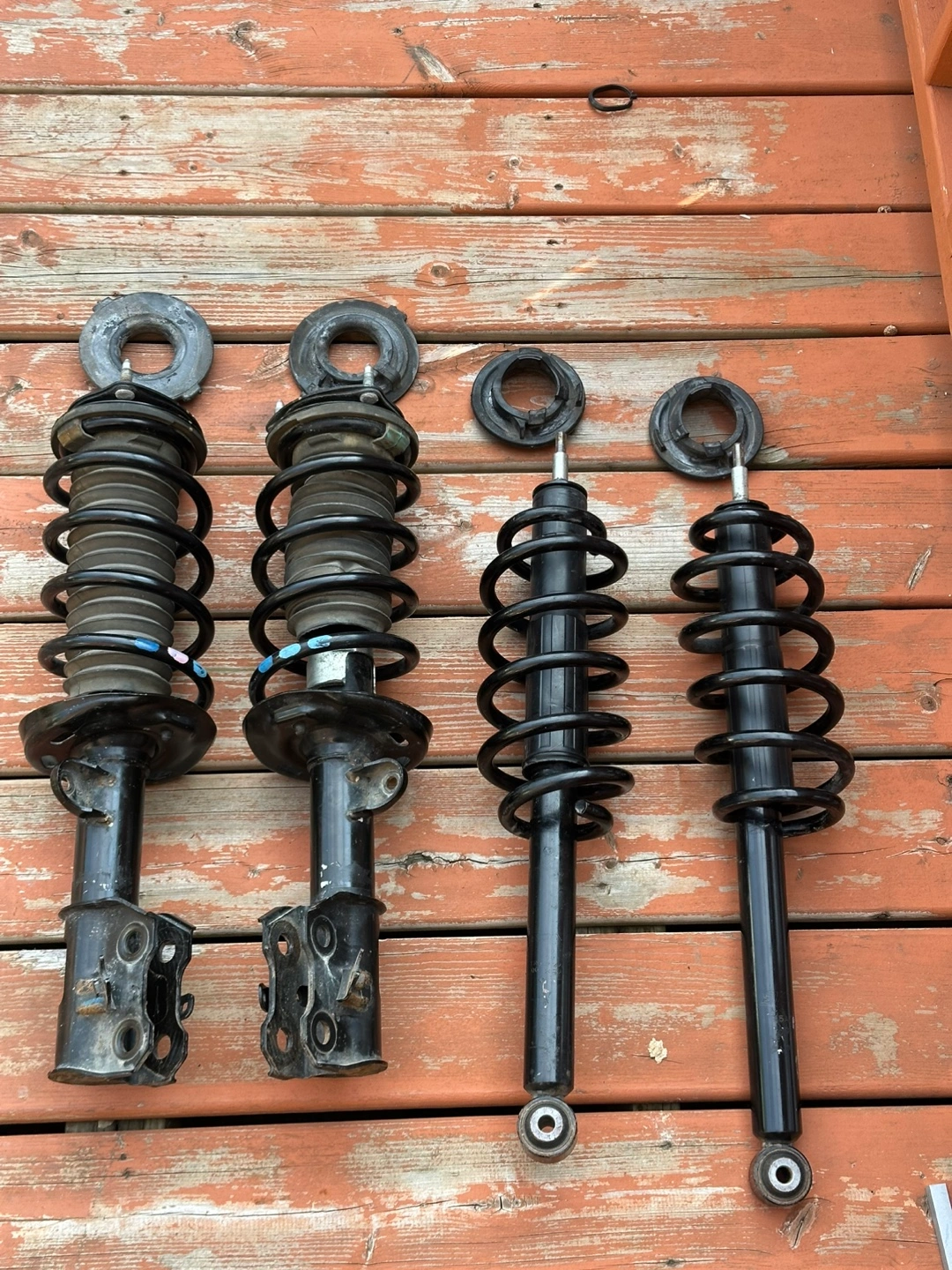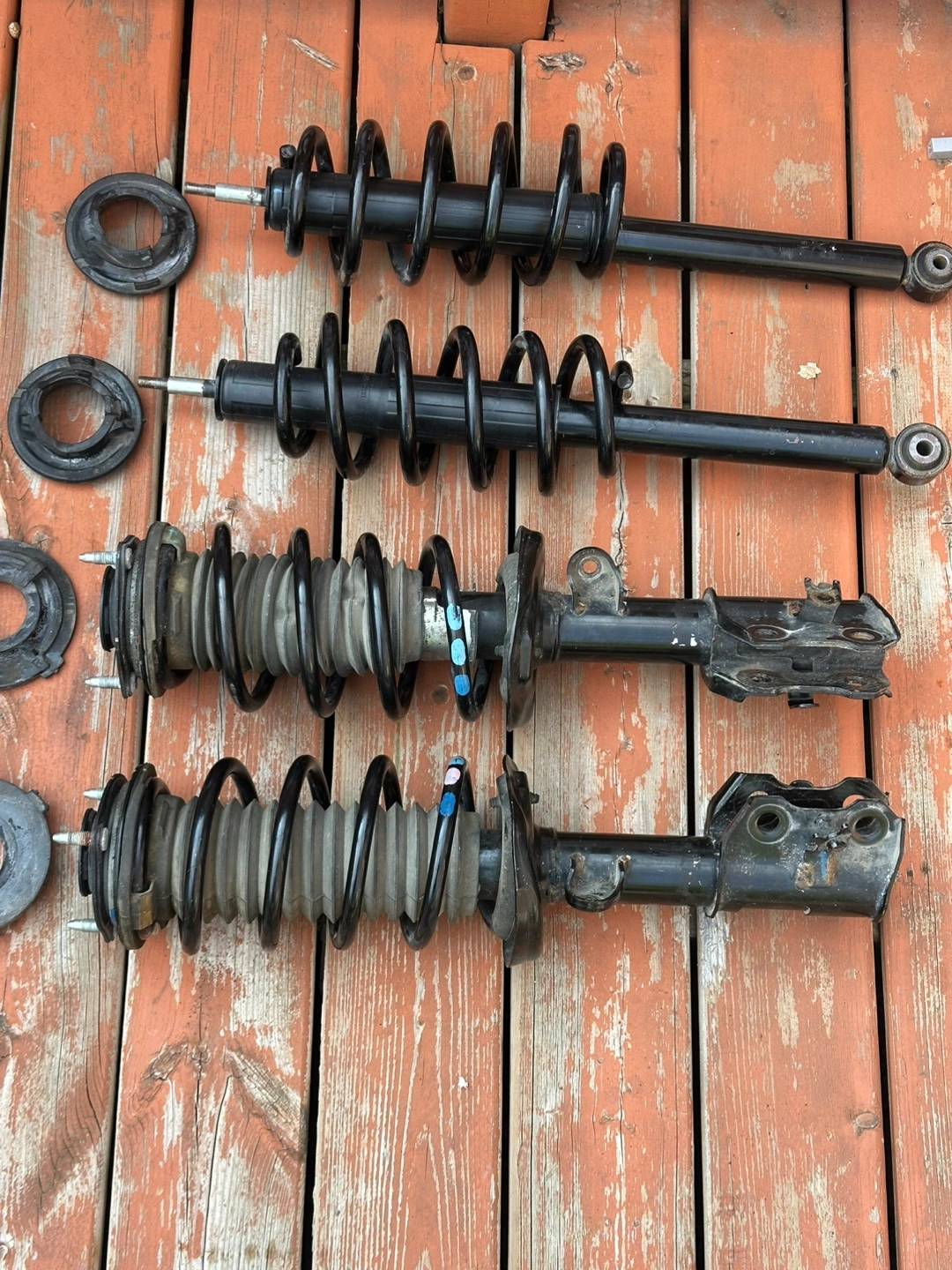 Front Rear Complete Struts Shock Absorber with Coil Spring Fit for Toyota Camry (Excludes SE Models) 4Cyl 2.4l 2007-2011, 6Cyl 2.5L 2010 2011, 172307 172308 172310 172309 (Set of 4) Its good condition use only 60000 km only like a new no leaking no damage A set of vehicle suspension parts. Each piece is black. Some pieces have springs. These will keep your car running smoothly on the roads.