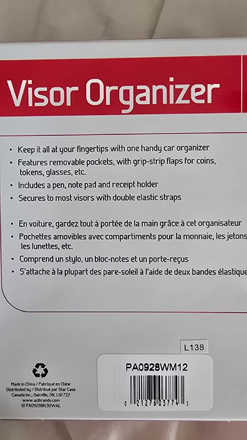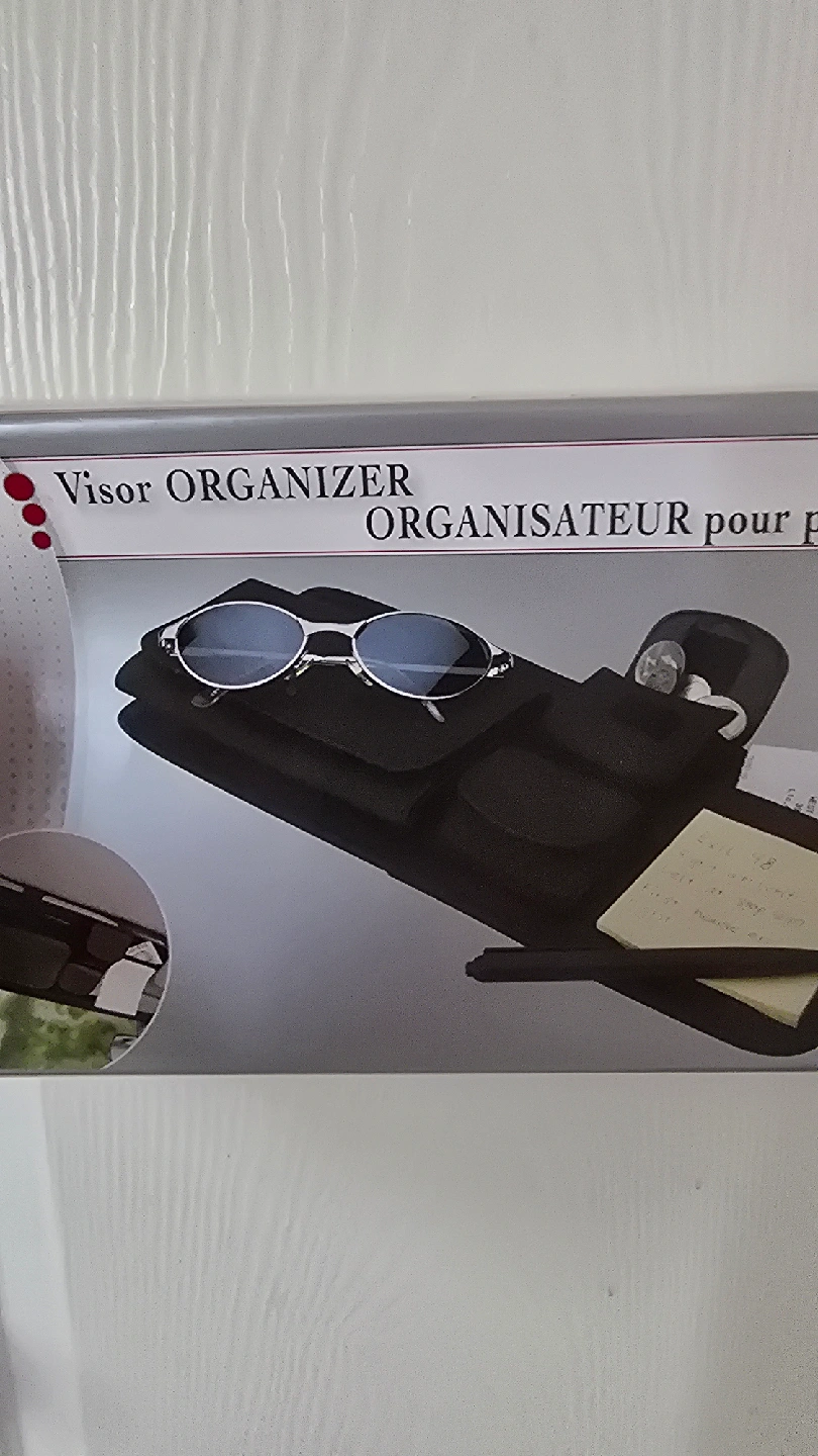 Keep your car essentials organized with this handy visor organizer! It features removable pockets with grip-strip flaps, perfect for coins, tokens, glasses, and more. It also includes a pen, notepad, and receipt holder. Secures easily to most visors with double elastic straps