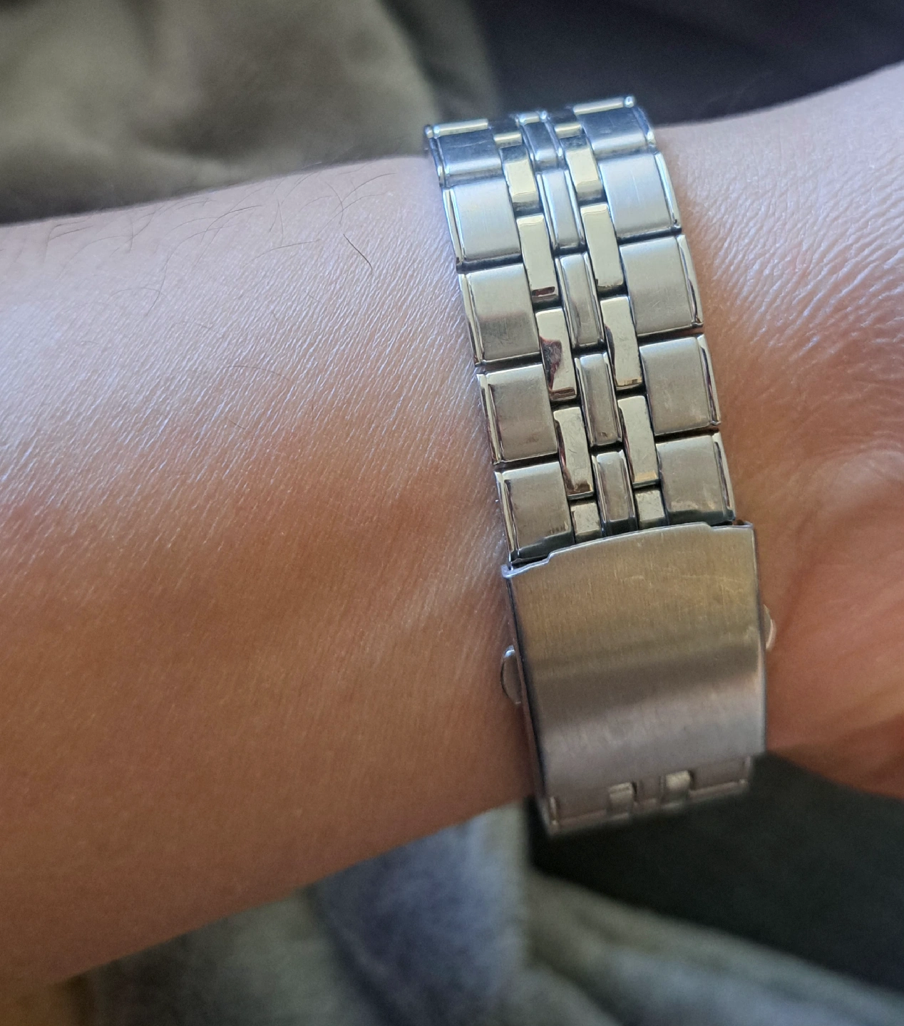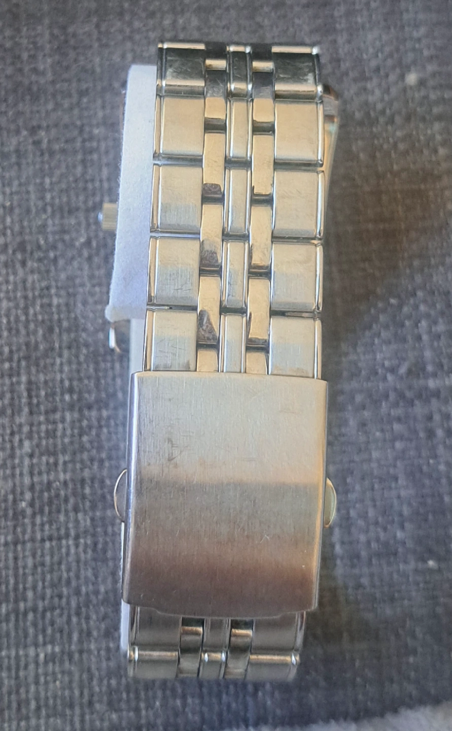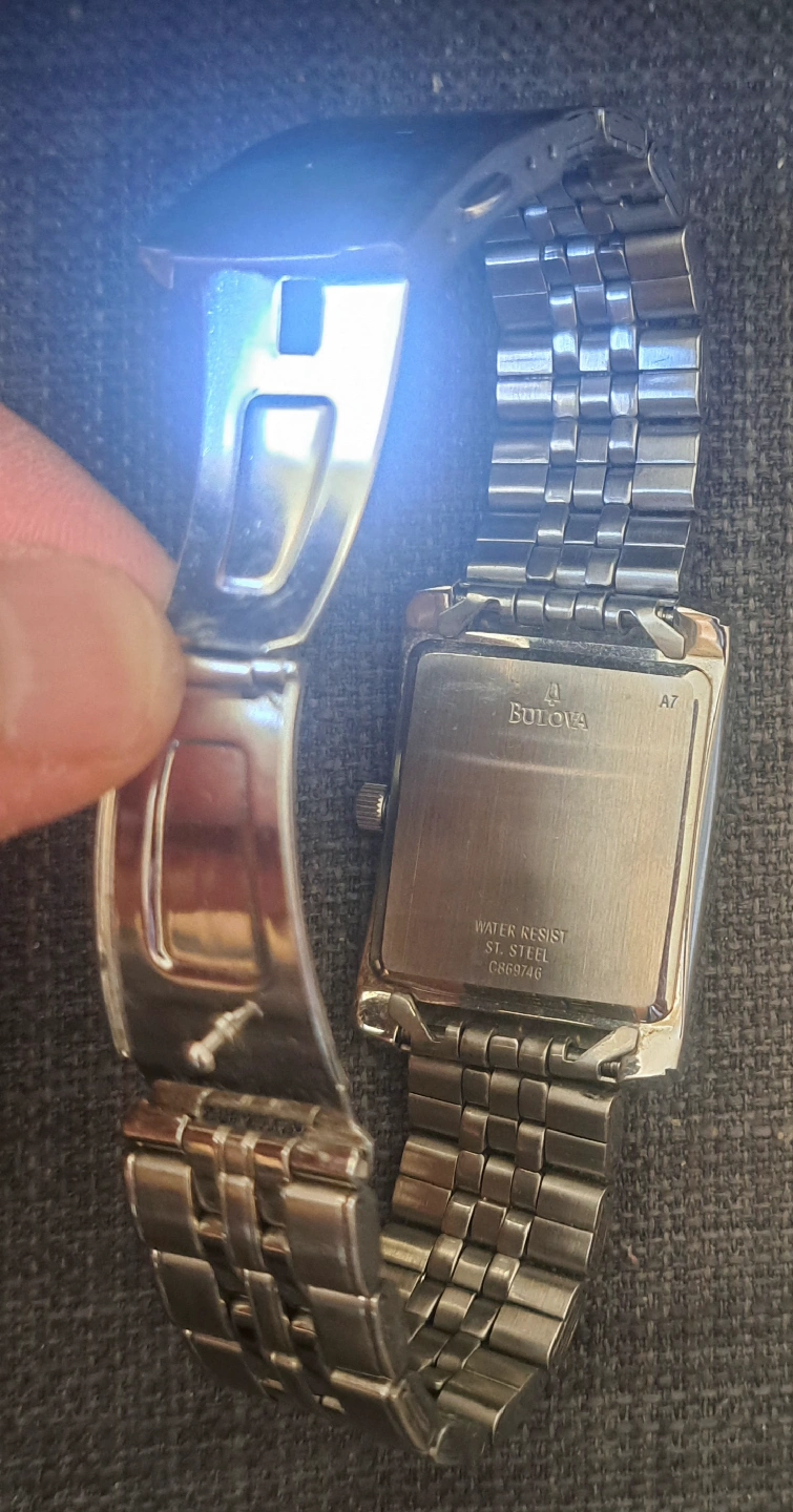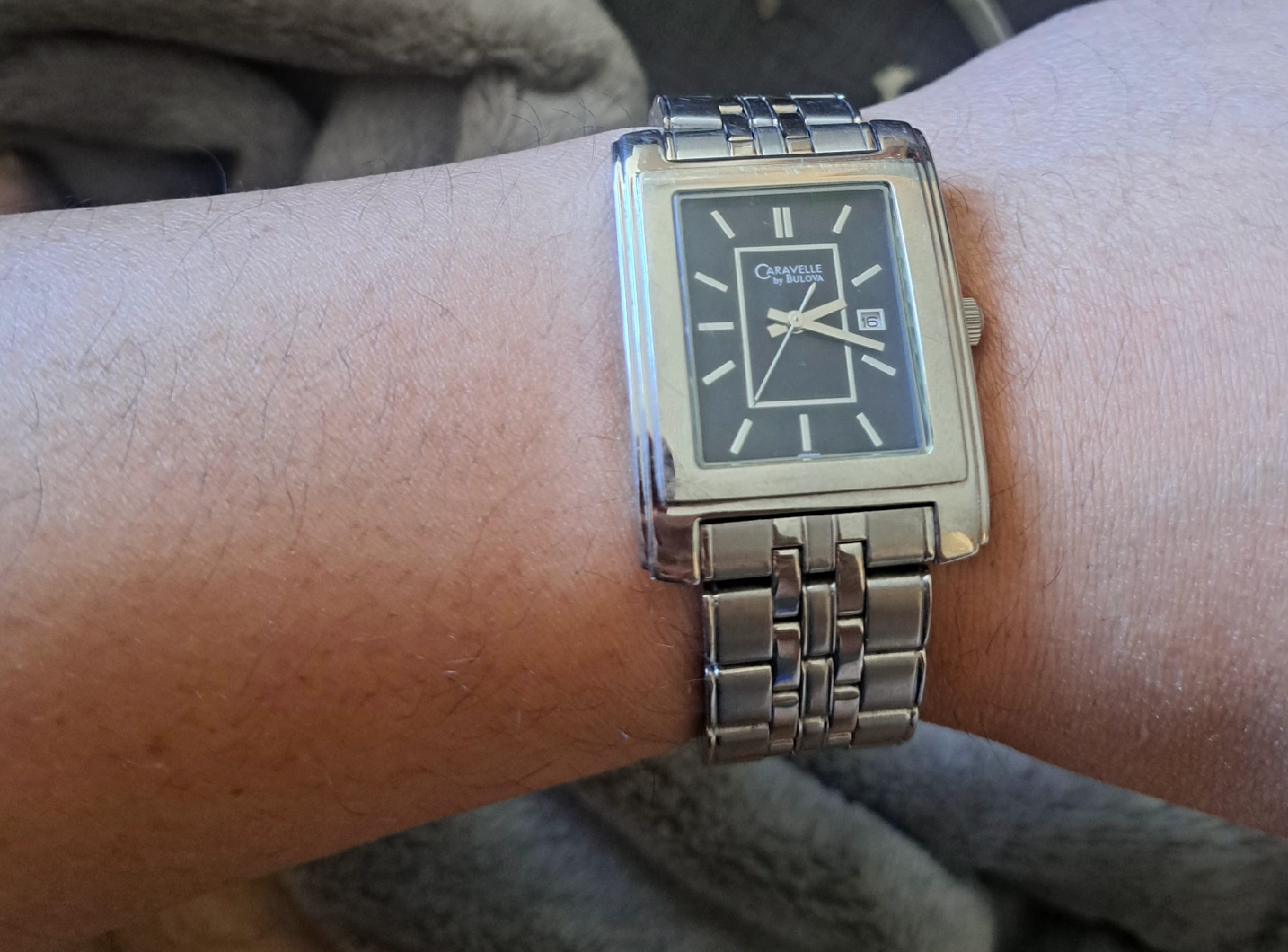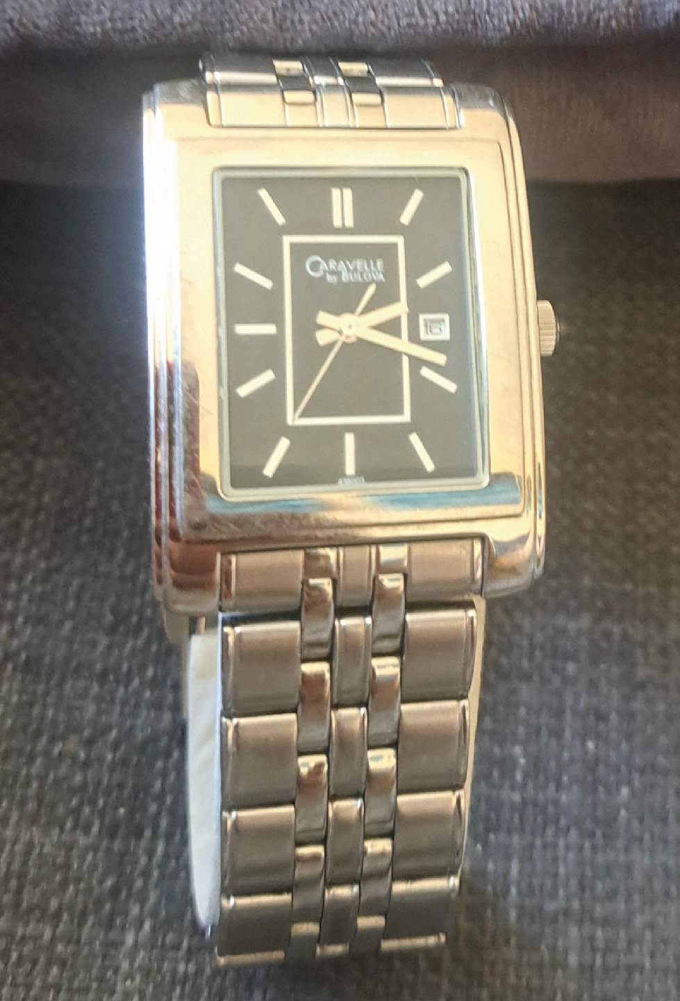 Selling a Caravelle by Bulova watch. It's a stainless steel watch with a rectangular face. It's in good condition and ready for a new home.