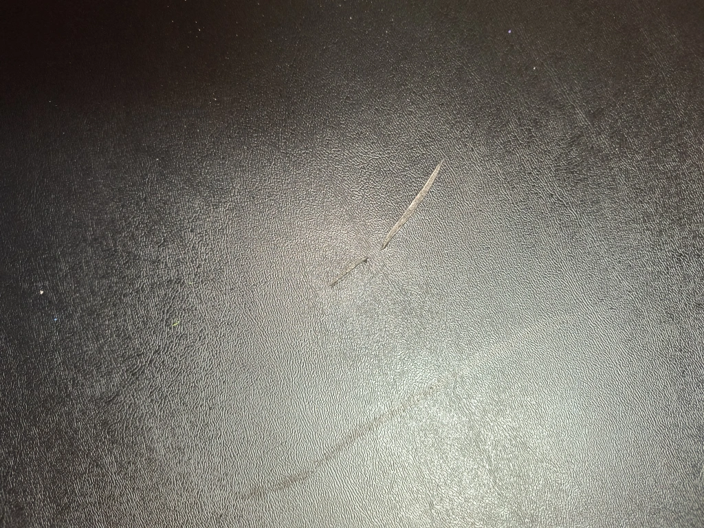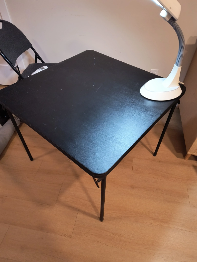 Small black foldable table. Square top, black metal legs. Minor surface scratches. Approximately 34 inches across. USES: CARDS, GAMES, CRAFT OR CAMPING TABLE