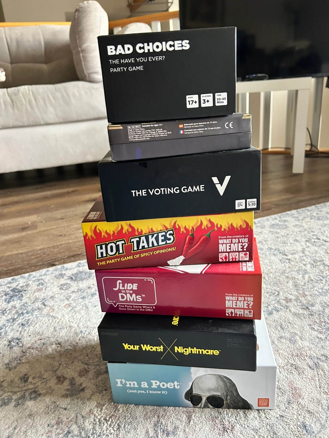 various card games. $5 for each, or all for $20. willing to negotiate price. available : i’m a poet (and yes i know it) fact or fiction your worst nightmare the voting game slide in the dms hot takes bad choices