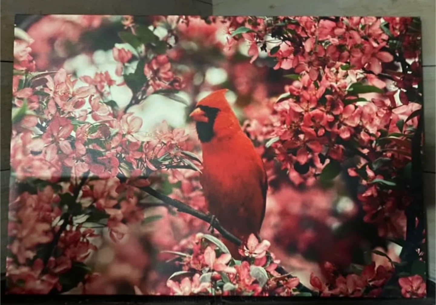 A beautiful piece of wall art featuring a vibrant cardinal perched among pink blossoms. This would add a lovely touch of nature to any room!