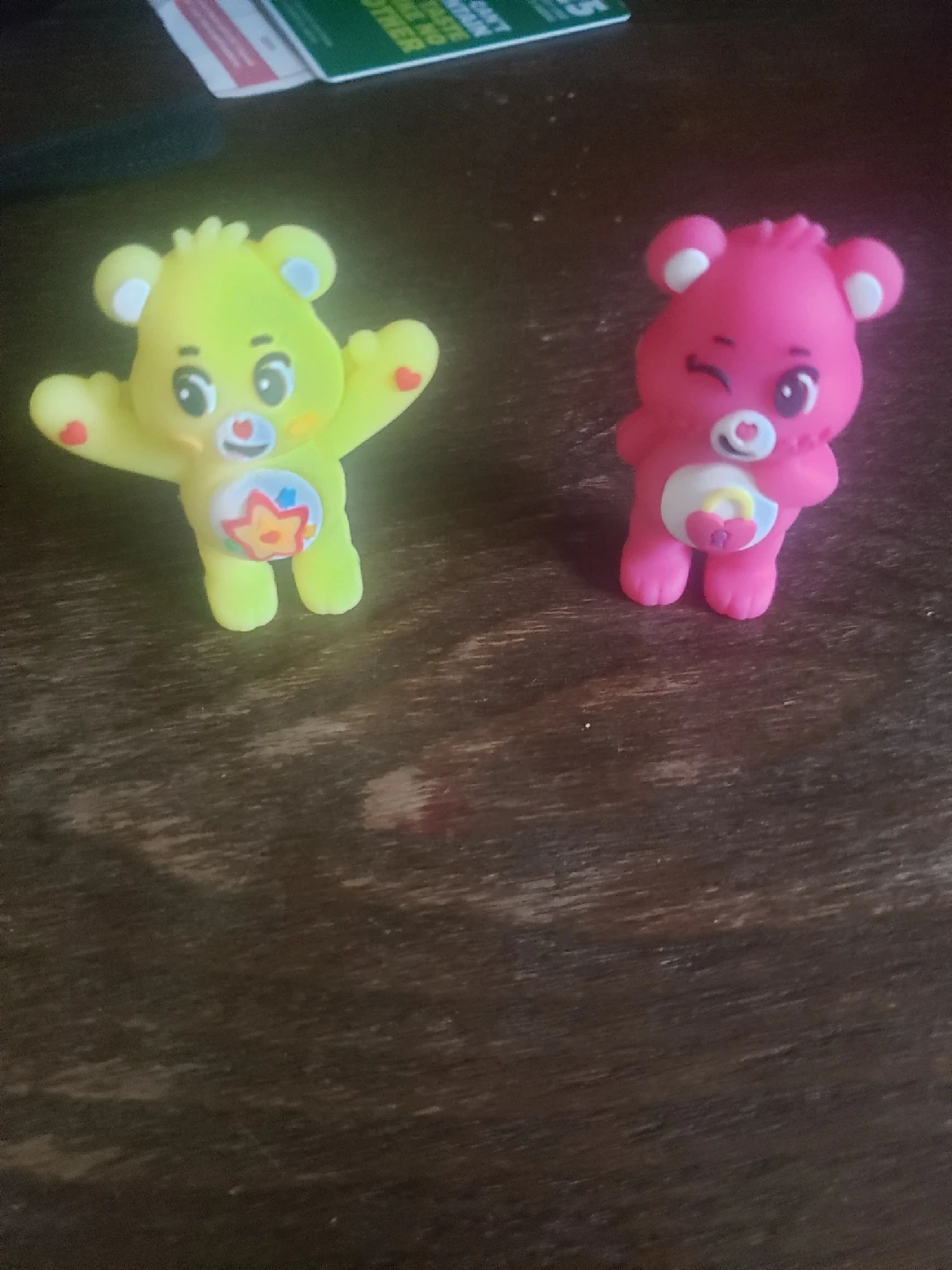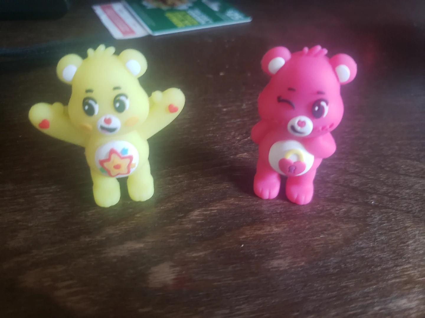 Two cute Care Bears figurines! One is yellow with a star on its tummy, and the other is pink with a heart. Perfect for a collector or just for fun!