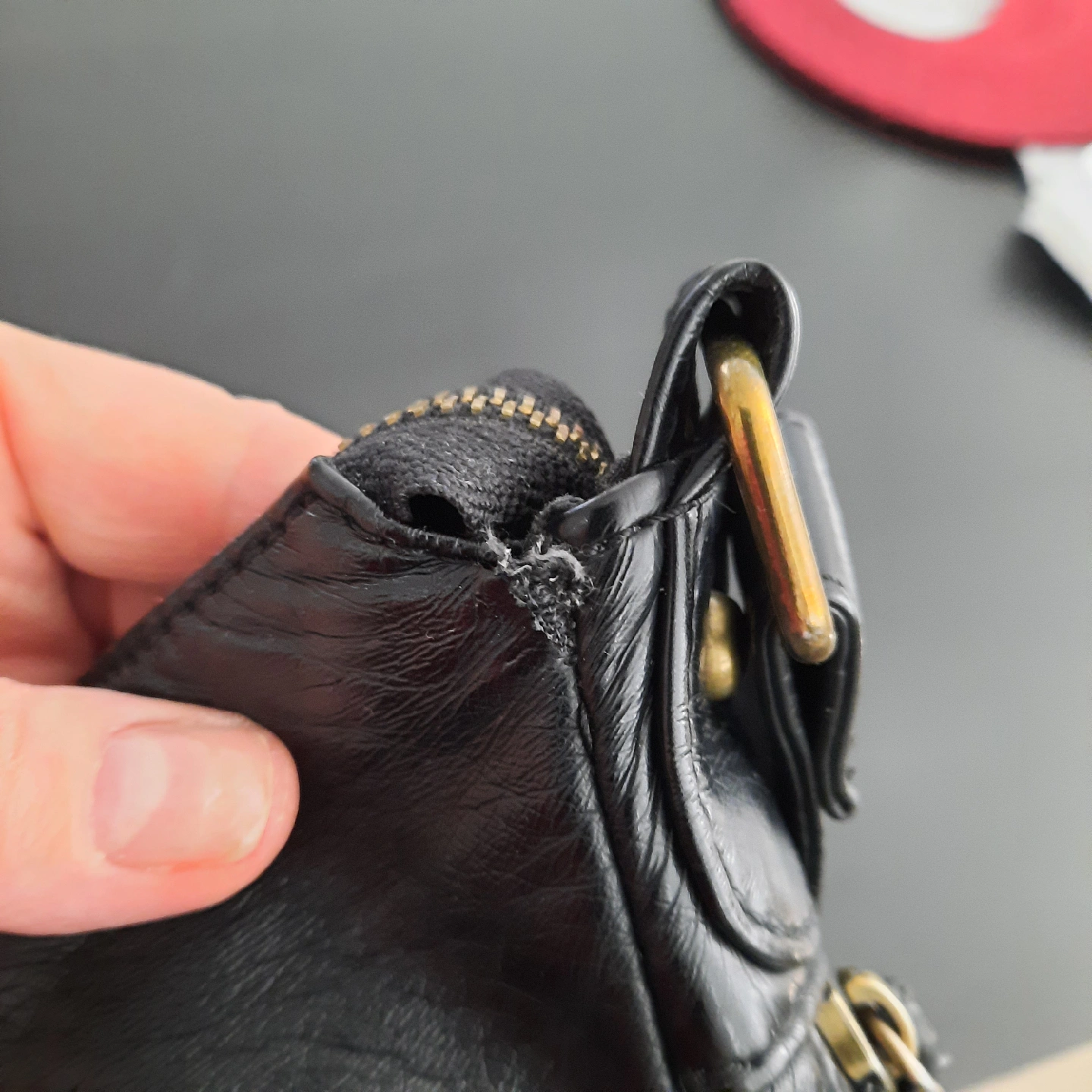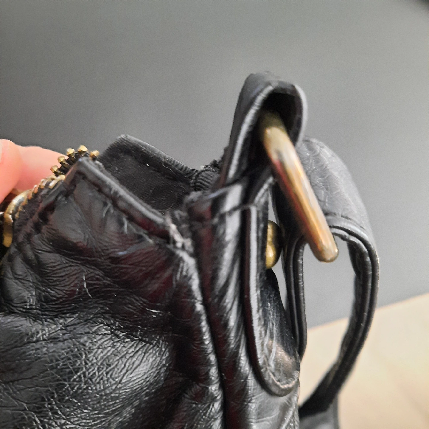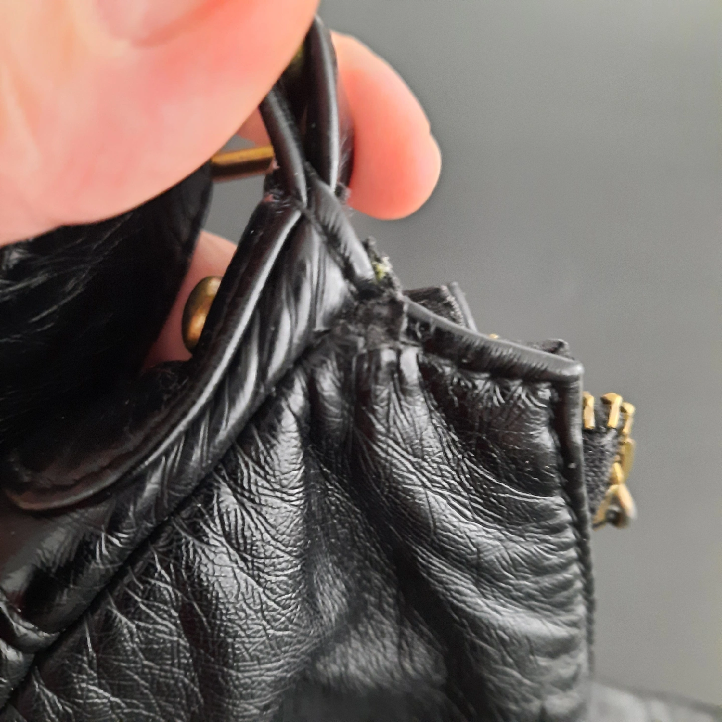 Cargo bag/purse - faux leather - adjustable straps - no rips or tears in the inner-lining - very small tear on the front, as circled in image - some stress/tear where the handles meet the bag, as images show