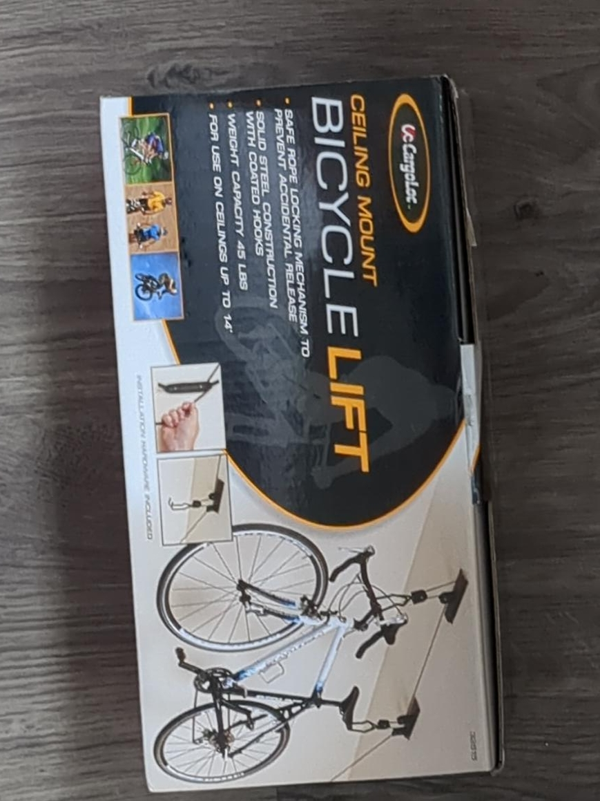 Selling a brand new CargoLoc ceiling mount bicycle lift! It's still in its original packaging and ready to install. This lift features a safe rope locking mechanism to prevent accidental release, solid steel construction with coated hooks, and a weight capacity of 45 lbs. It's designed for use on ceilings up to 14 feet. Installation hardware is included, so you'll have everything you need to get your bike up and out of the way!