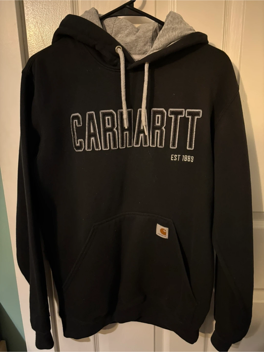 Selling a Carhartt black hoodie in size small. It features a grey hood lining and the Carhartt logo on the front. The hoodie is a loose fit and there is slight pilling on the front - pice reflecting