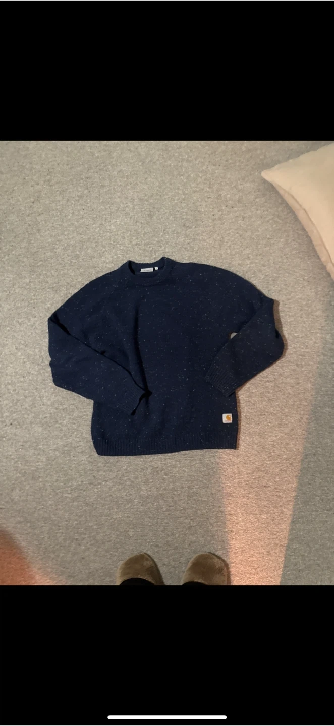 Cozy Carhartt WIP knit sweater in navy with white speckles. It's a size large and in great condition! Perfect for staying warm this season