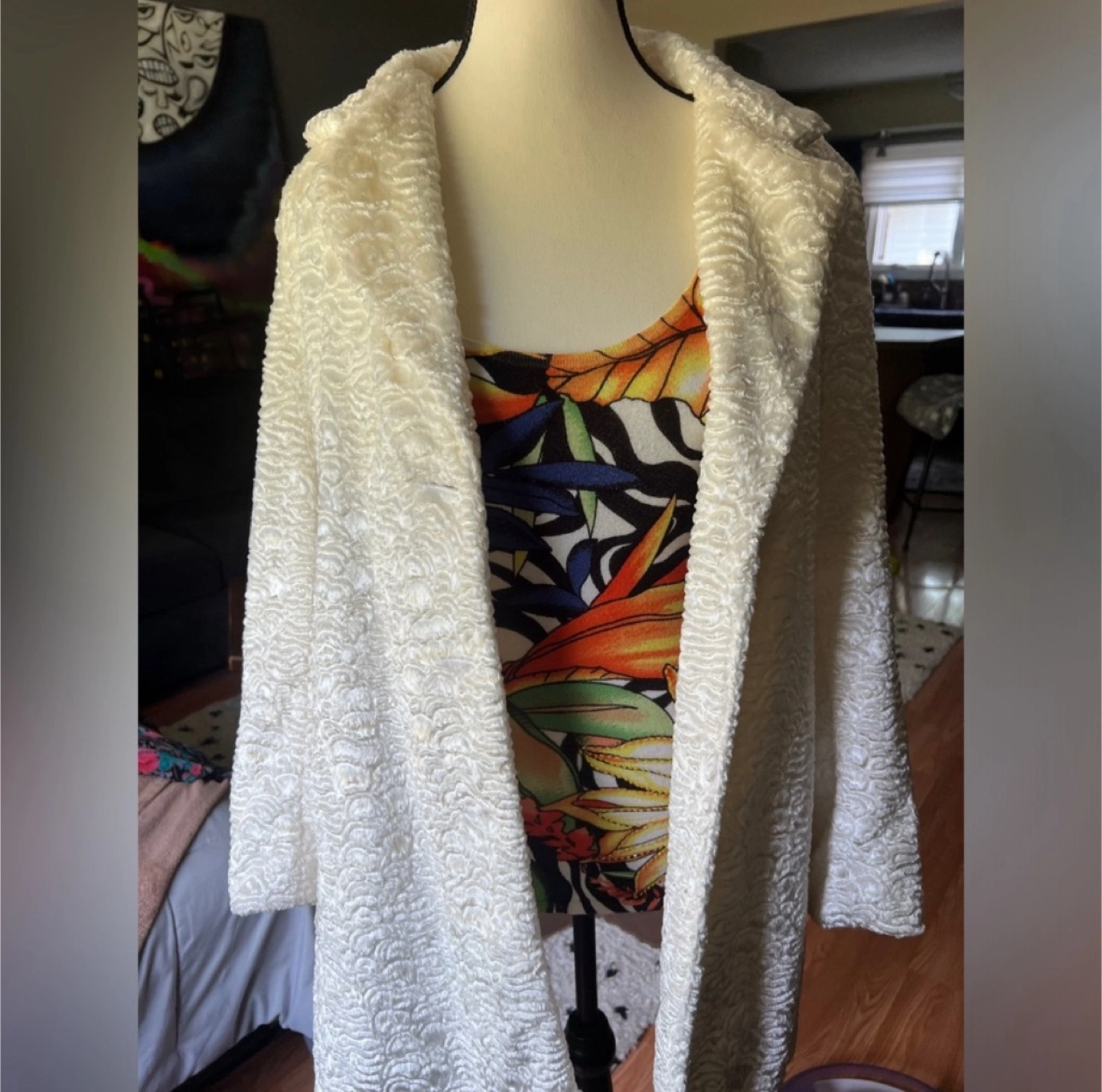 Show allSelling a stylish white textured coat. It's in great condition and would be a lovely addition to your wardrobe!l Has front button closure. Size 4